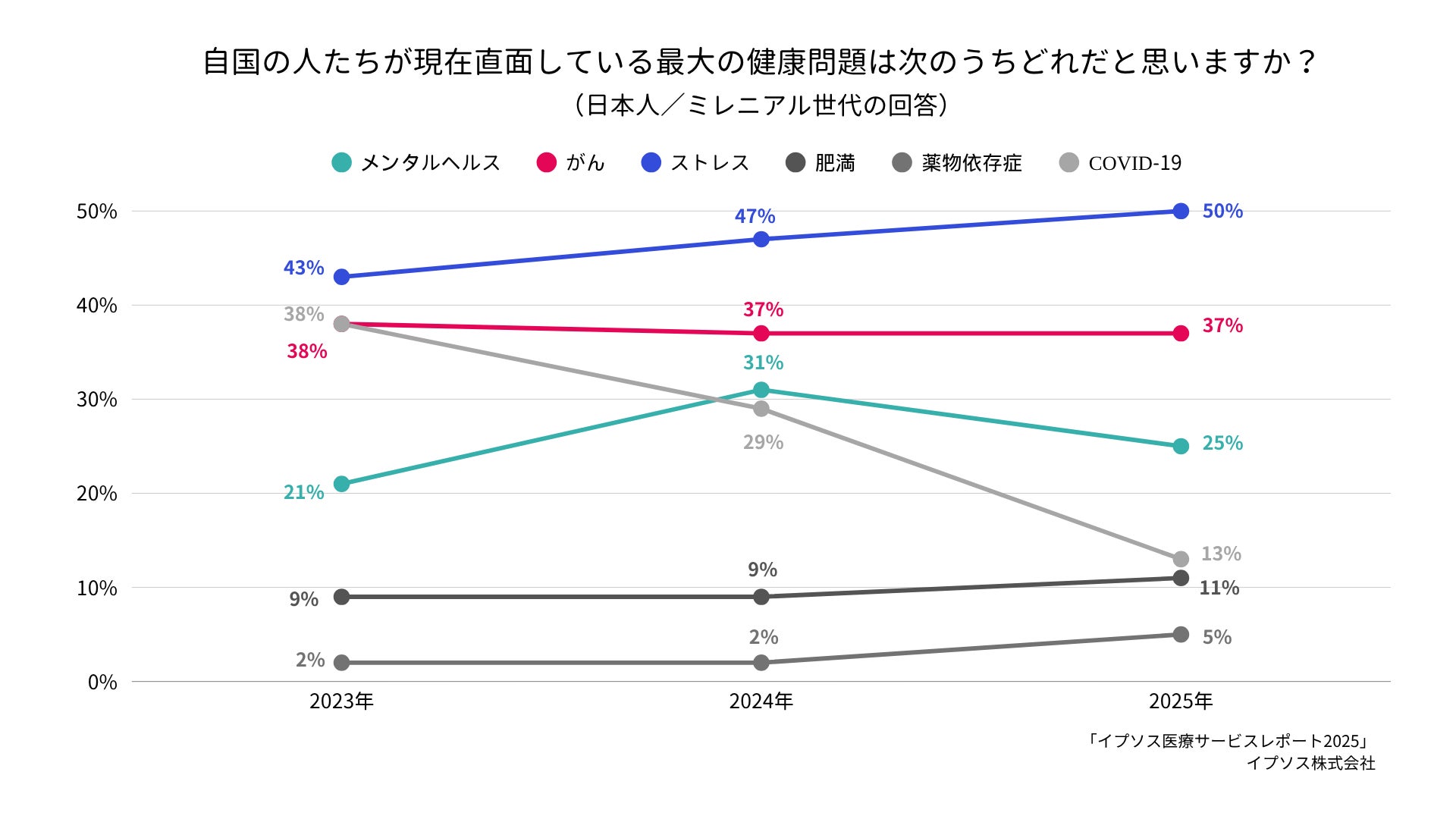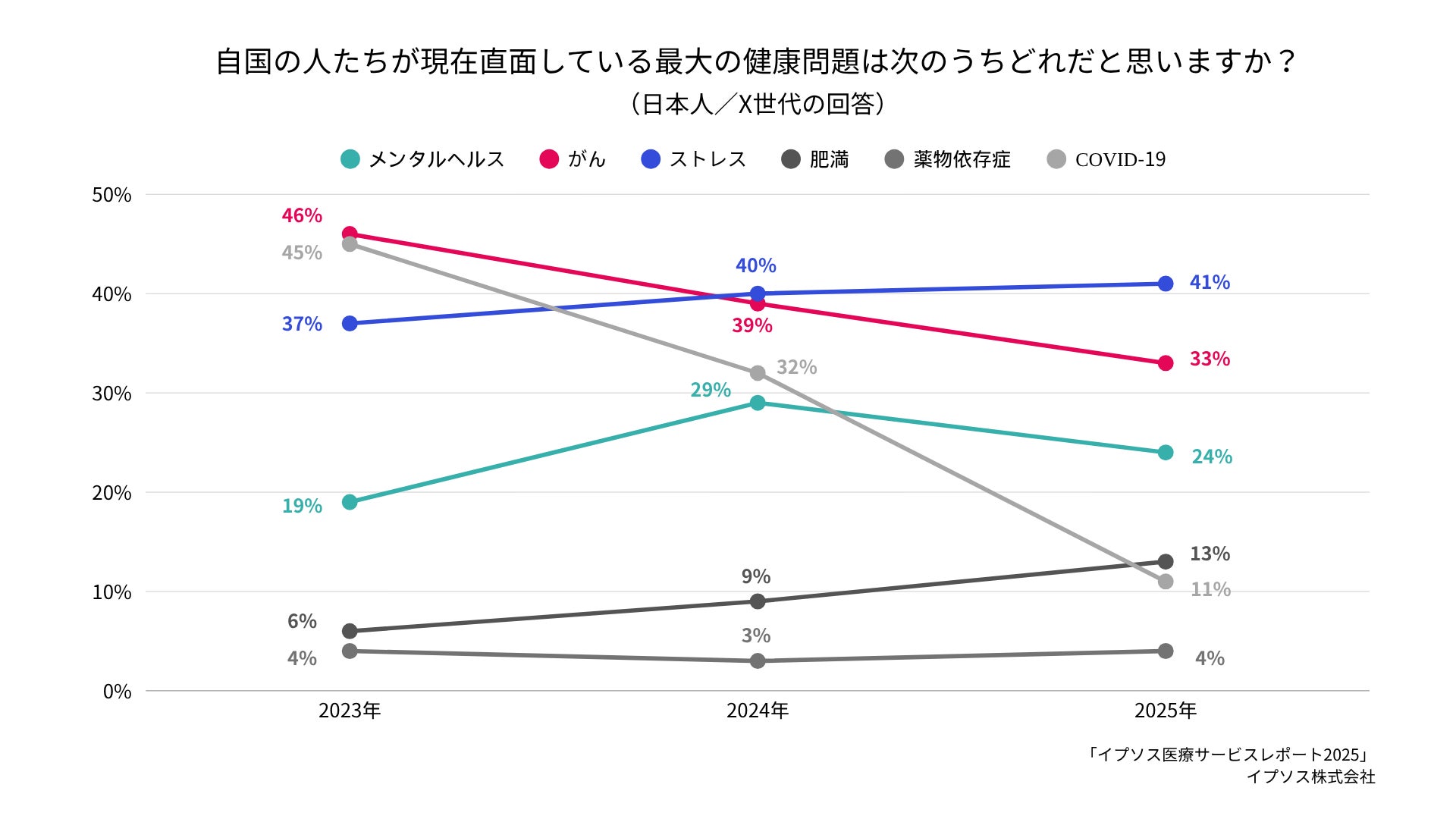 世界最大規模の世論調査会社イプソス株式会社(日本オフィス所在地:東京都港区、代表取締役:内田俊一)は、日本を含む世界30か国23,172人を対象に、医療に関する意識調査を実施しました。調査の結果、Z世代が最大の健康問題として選んだ項目は「がん(44%)」で、一昨年の2位から13ポイント増加しました。次いで「メンタルヘルス(39%)」が多く、こちらも過去2年で15ポイント増加しています。一方、昨年まで1位だった「ストレス(38%)」は、ピーク時の42%から4ポイント減少しました。尚、他の世代での1位は、ミレニアル世代は「ストレス」、X世代は「がん」という結果でした。