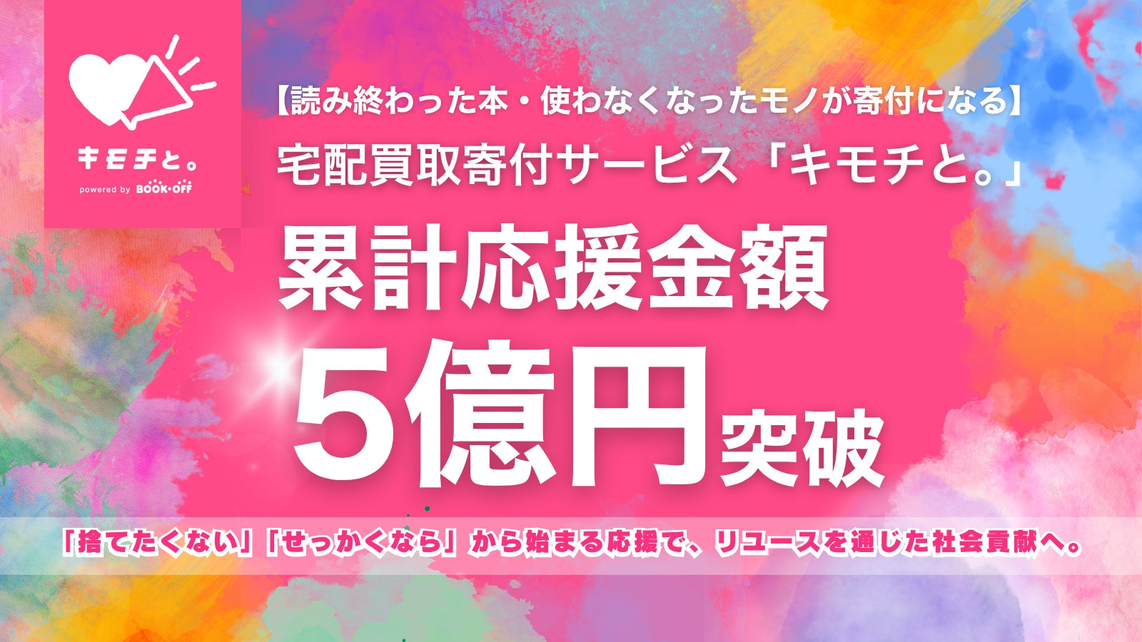 ブックオフグループホールディングス株式会社(本社:神奈川県相模原市、代表取締役社長:堀内康隆)の子会社で、リユースショップ「BOOKOFF」等を運営するブックオフコーポレーション株式会社(以下、ブックオフ)は、不要品の査定額を通じた社会貢献を目的とした宅配買取寄付サービス「キモチと。」を2019年4月より展開。7年目となる2025年9月末時点で、累計応援金額5億円を突破いたしました。今後も、生活者の「捨てたくない」「せっかくなら役立てたい」という想いを叶える手放し方で、循環型社会の推進と社会貢献に参加できる機会を提供してまいります。