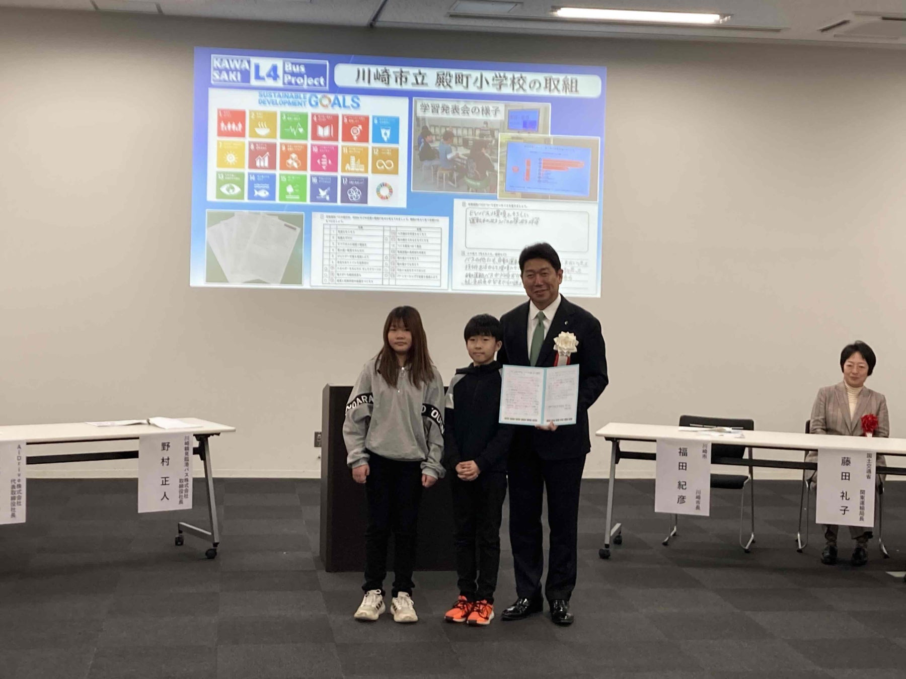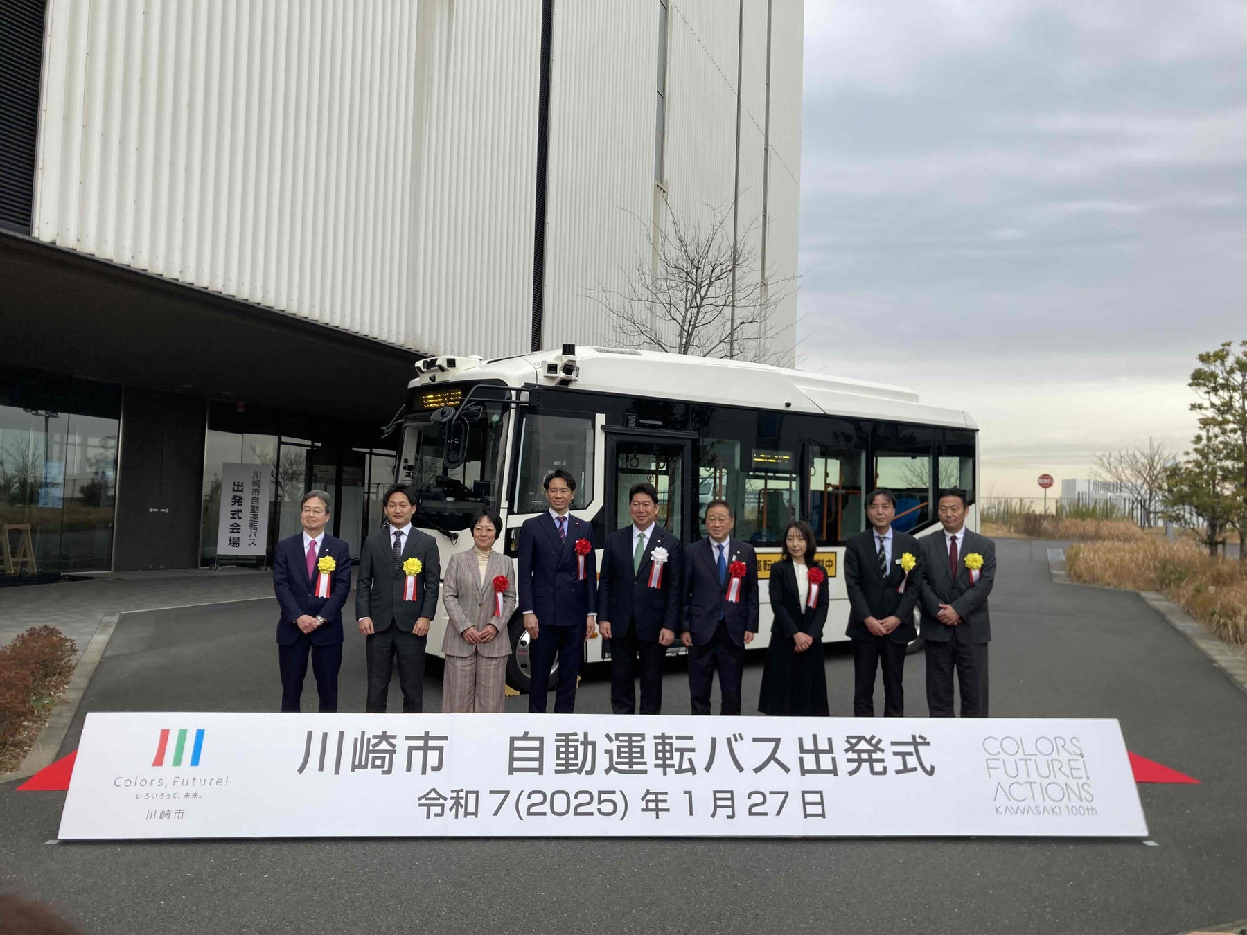 実証実験の開始日である令和7年1月27日(月)に、川崎生命科学・環境研究センターで出発式を行いました。自動運転レベル4の実装を加速させることを目的に設置した「川崎市レベル4モビリティ・地域コミッティ」の関係者などが出席し、川崎市長とともに自動運転バスに試乗しました。また、これまで自動運転とSDGsについて学んできた市立殿町小学校5年生の代表児童から、学習内容や取組への期待を発表しました。
