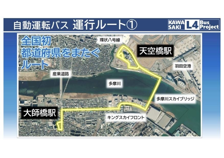 川崎市では、全国に先駆けて、自動運転レベル4のシステムを搭載したティアフォー社(愛知県名古屋市)製Minibus2.0を令和6年12月25日(水)に納車し、現在、川崎鶴見臨港バスが路線バスとして営業運行を行っている「大師橋駅(川崎市川崎区)~天空橋駅(東京都大田区)」及び「川崎駅~市立川崎病院(川崎市川崎区)」の2ルートにおいて、令和9年度の自動運転バス(レベル4)の実装を目指した実証実験を令和7年1月27日(月)から開始しました。(今年度の自動運転のレベルは「2 実証実験の概要」を参照)