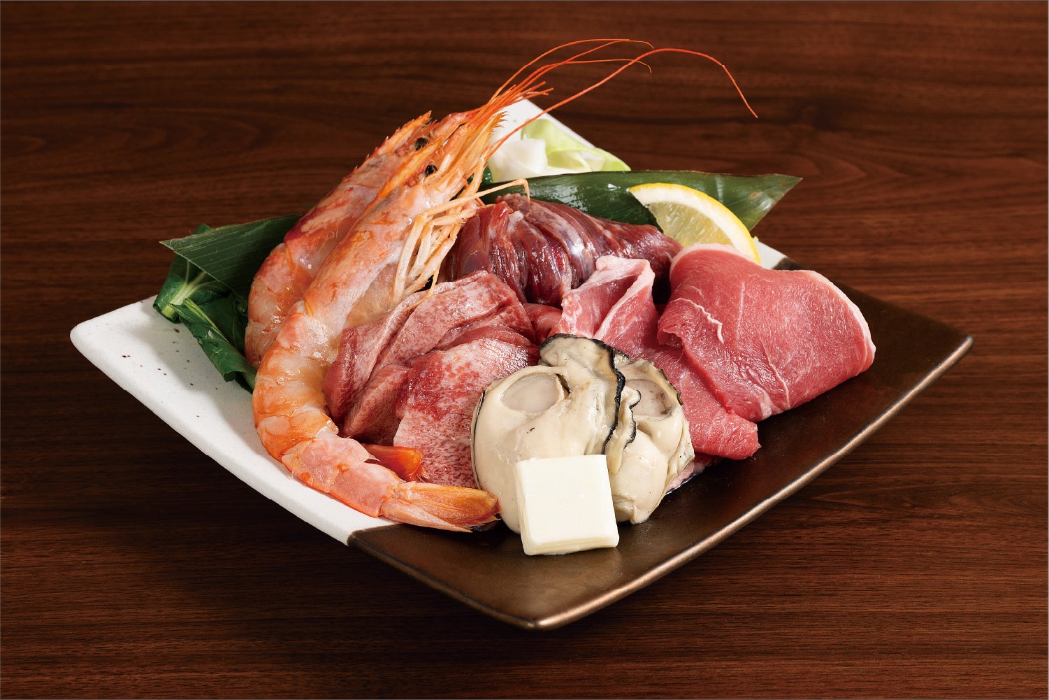 ラム肉、牛タン、牛ハラミ、牡蠣、赤海老と、お肉と海の幸をひと皿につめ込みました。欲張りな心を満たす贅沢メニューです。