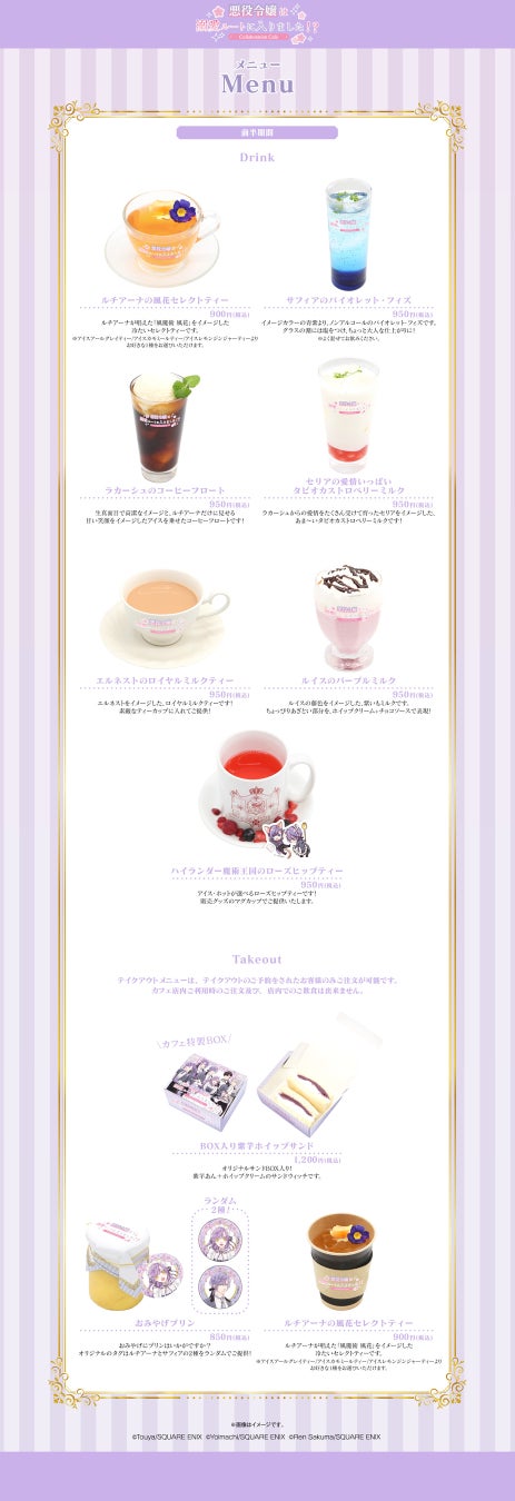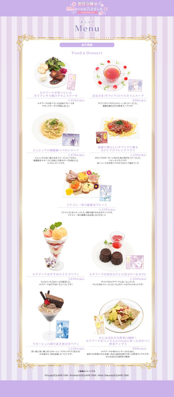 2025年4月23日(水)から開催する「悪役令嬢は溺愛ルートに入りました!?」Collaboration Cafeについて、本日前半期間(4月23日(水)~5月22(木))に提供するカフェオリジナルのコラボメニューを公開いたしました。