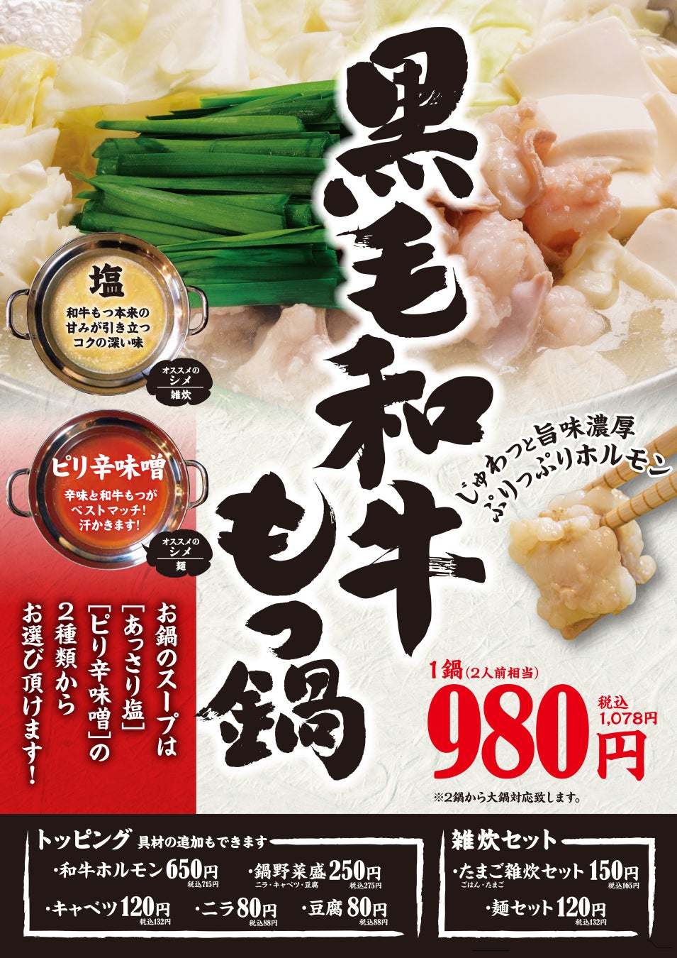 黒毛和牛塩もつ鍋 1鍋(2人前相当)980円(税込1,078円)