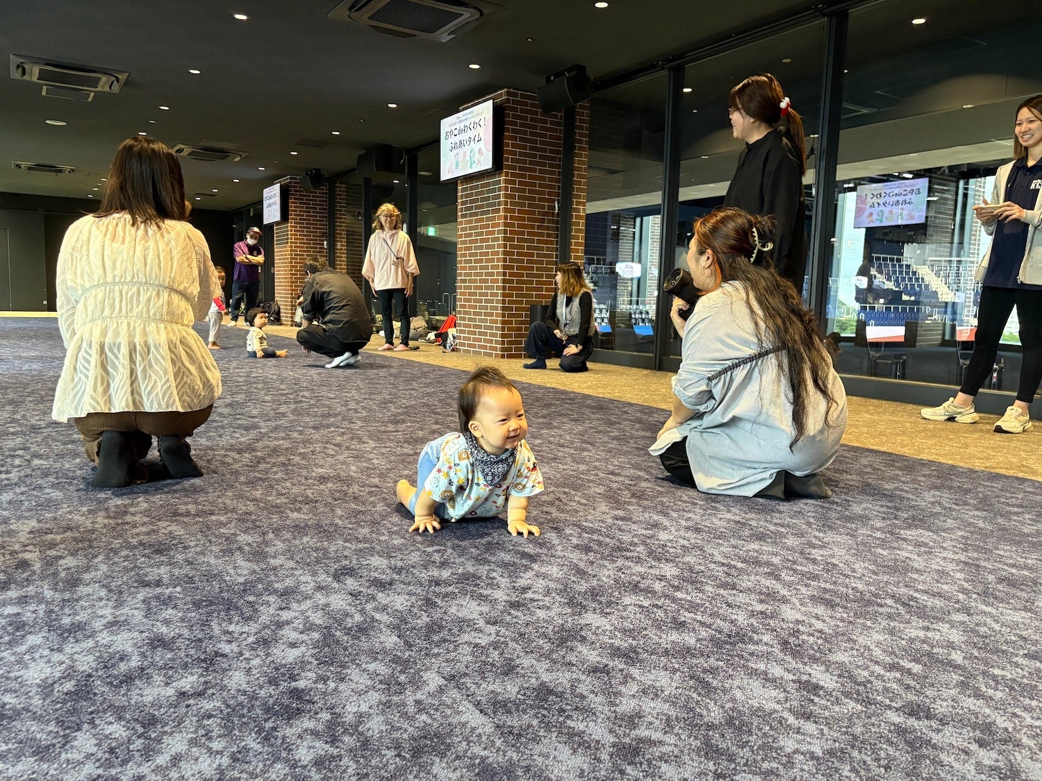 子どもスポーツ教室はサブアリーナで実施していますが、乳幼児の安全面・保護者の動線・ベビーカー利用などを考慮し、今回は初めて4Fラウンジを“親子のための運動空間”として活用し、アリーナの新しい活用モデルとしても大きな意味を持つ取り組みとなりました。