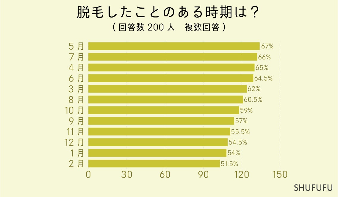 脱毛したことのある時期は?(複数回答)の問いに対して最も多かったのが「5月(67%)」でした。 次いで「7月(66%)」「4月(65%)」という結果でした。春から夏前の月は特に多くなっていましたが、夏冬問わず年間を通して常に脱毛を行っている人も多かったです。