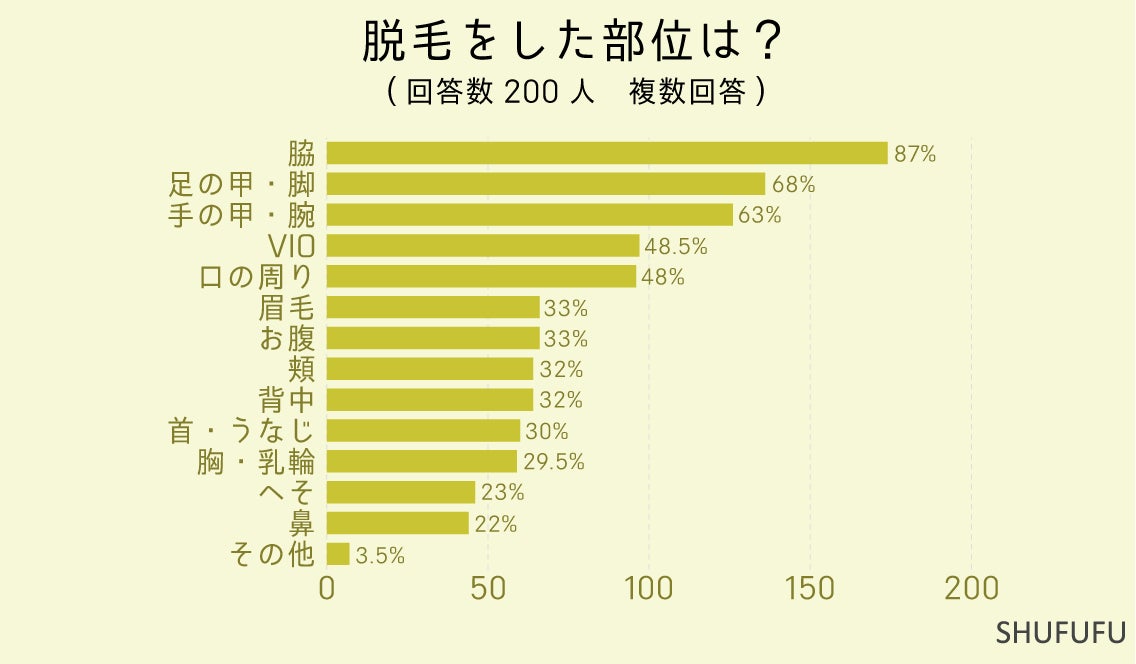 脱毛をした部位に関しては、「脇」が1位でした。脇のムダ毛は見た目の問題だけでなく、臭いの原因にもなる箇所なので気を使う人が多いようでした。