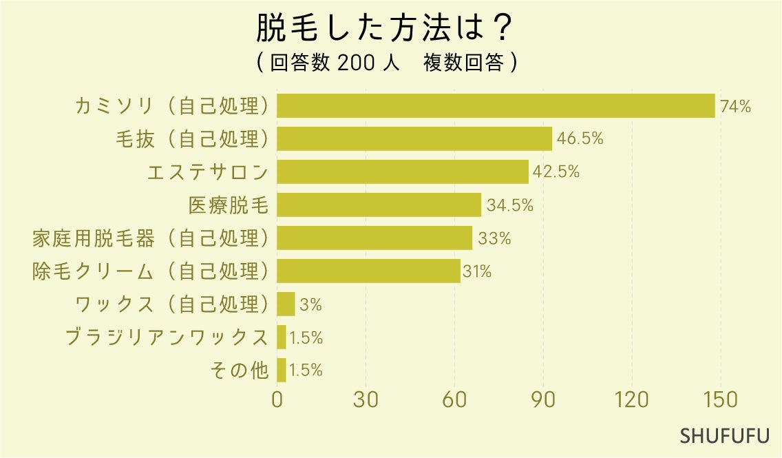 脱毛した方法を尋ねたところ、1位は「カミソリ(自己処理)(74%)」、2位「毛抜(自己処理)(46.5%)」となりました。カミソリや毛抜での脱毛処理は安価で自宅で手軽にできるため人気なようです。
