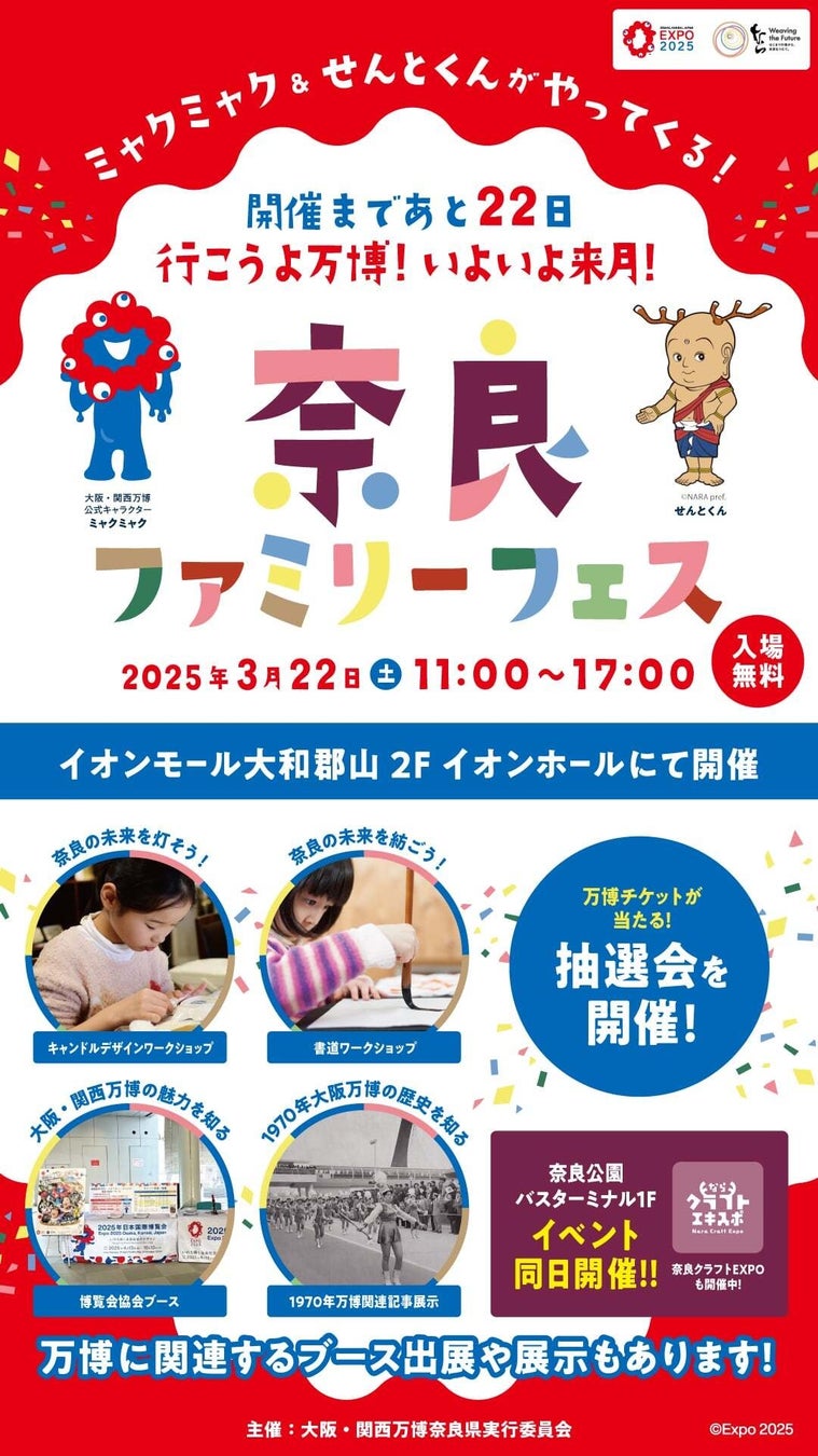2025年3月22日(土曜日)に大阪・関西万博開幕直前イベント「開幕まであと22日!行こうよ万博!いよいよ来月!奈良ファミリーフェス」 を開催します。