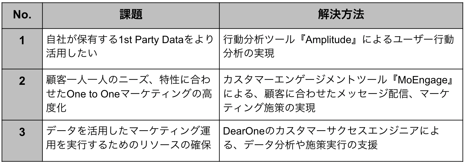 アートデコでは、マーケティングにおけるデータ活用において以下3点の課題があり、これらの課題解決のため、行動分析ツール「Amplitude」とカスタマーエンゲージメントツール「MoEngage」の導入を検討しました。