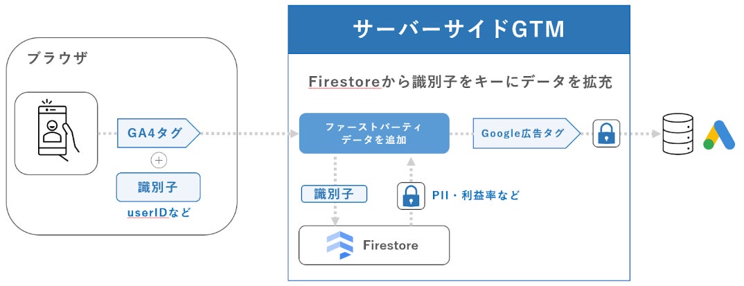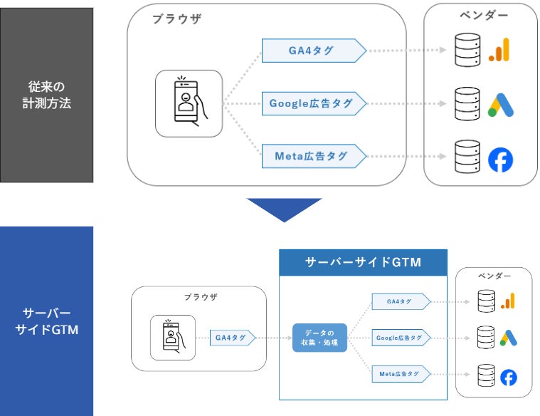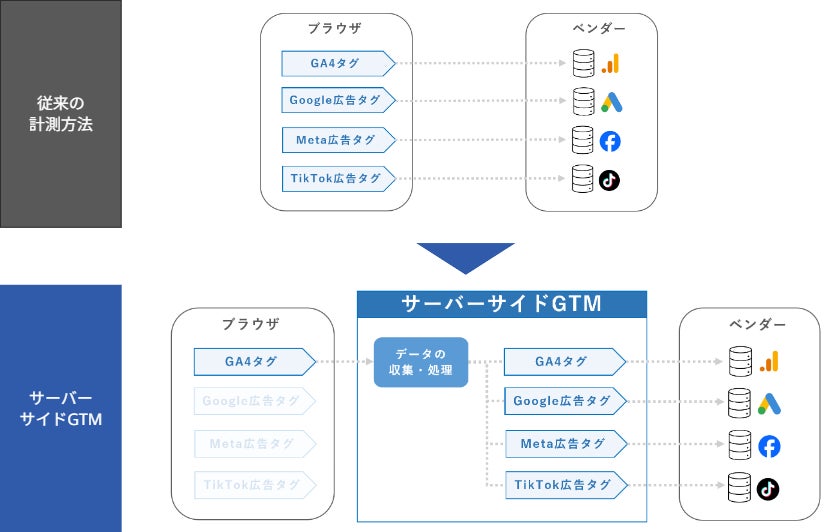 このような課題を解決する鍵として、『サーバーサイドGTM(以下、sGTM)』が大きな注目を集めています。sGTMは、従来のブラウザから直接ベンダーにデータを送信する手法とは異なり、データを自社サーバーで一度受け止めることで、企業が主体となってデータの流れをコントロールし、より安全で質の高いデータ活用を実現します。