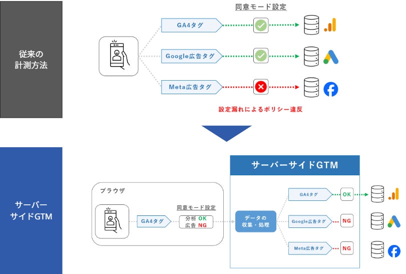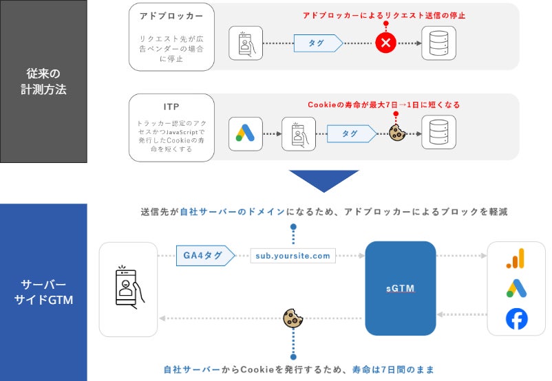 アドブロッカーの普及やITP(Intelligent Tracking Prevention)などのブラウザ機能強化により困難になった従来のクライアントサイドでのデータ計測を、サーバー経由にすることで影響を軽減し、より正確で信頼性の高いデータ計測を実現します。