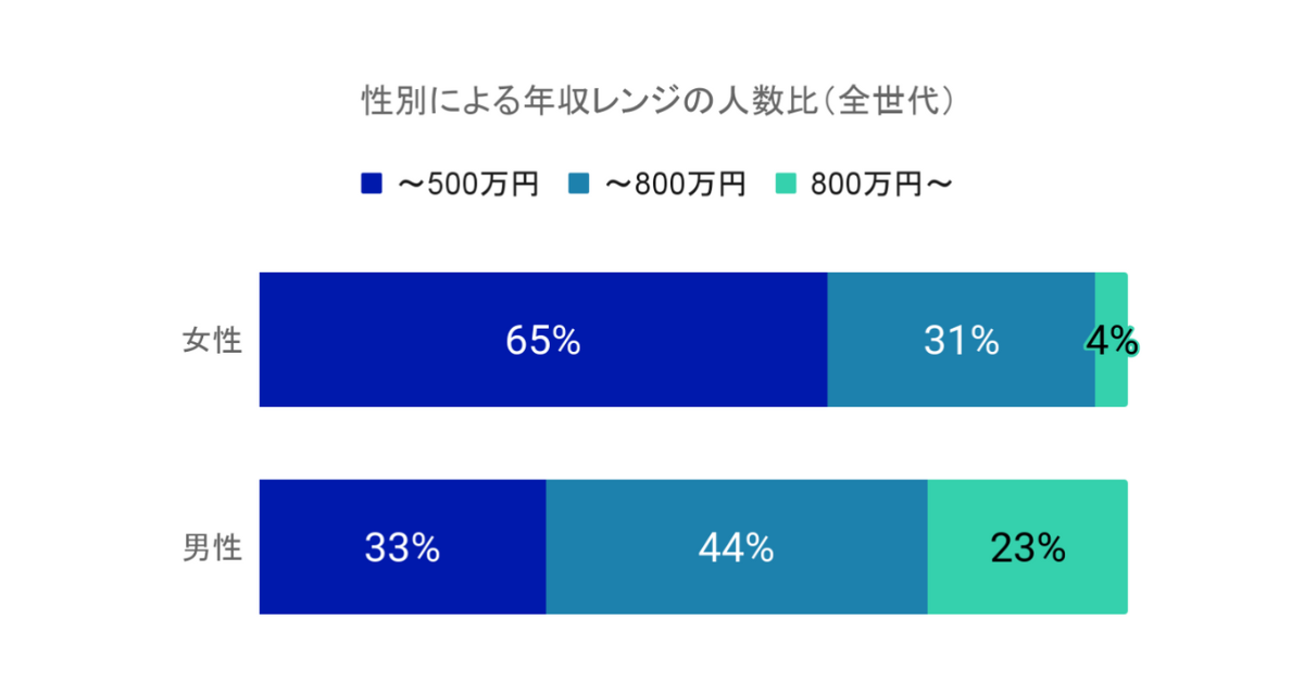 一般的に高給とされる年収800万円をベースに見てみると、年収800万以上の男性は23%もいるのに対して、女性は僅か4%。また女性は半数以上が500万円以下であるのに対し、男性のボリュームゾーンは500〜800万。