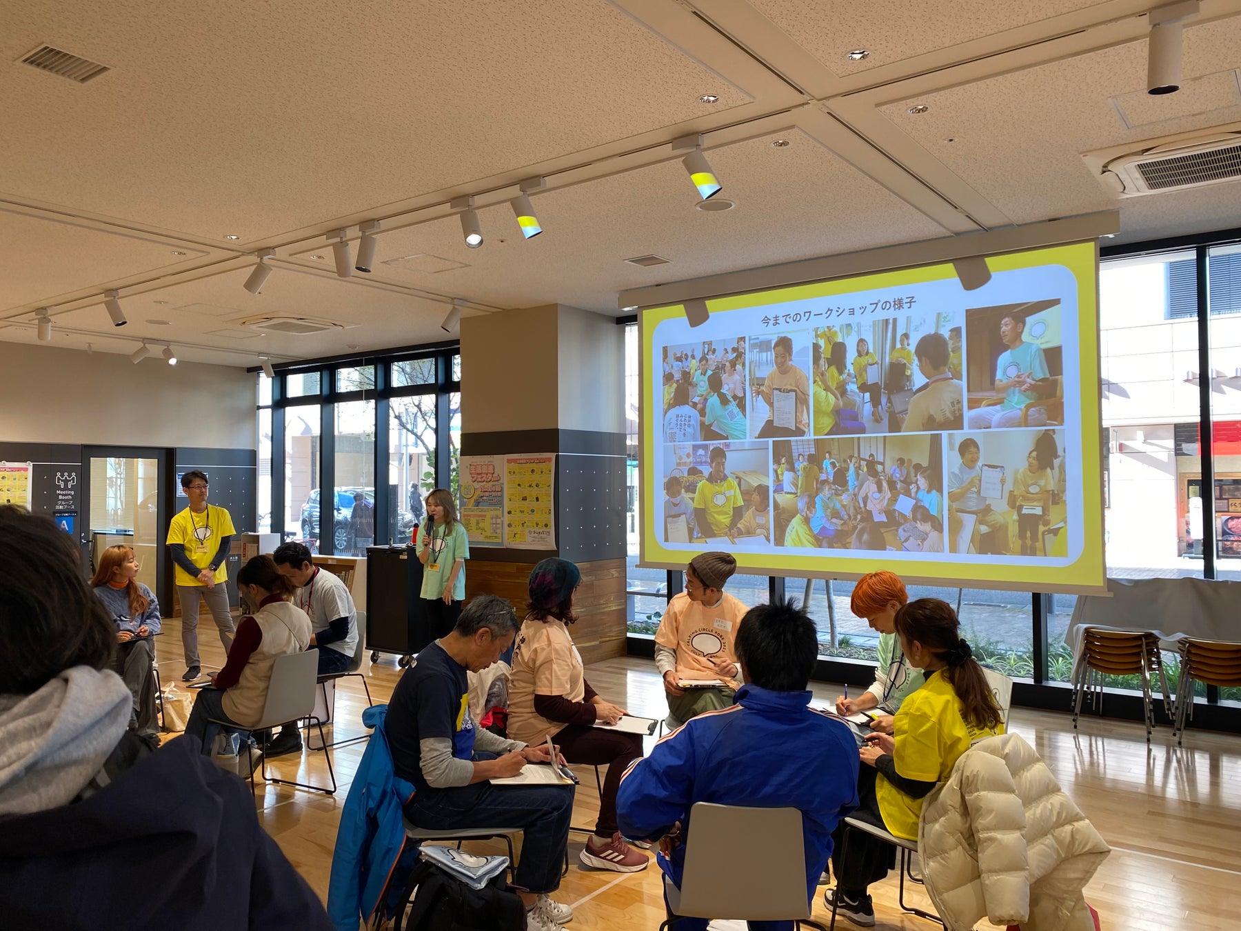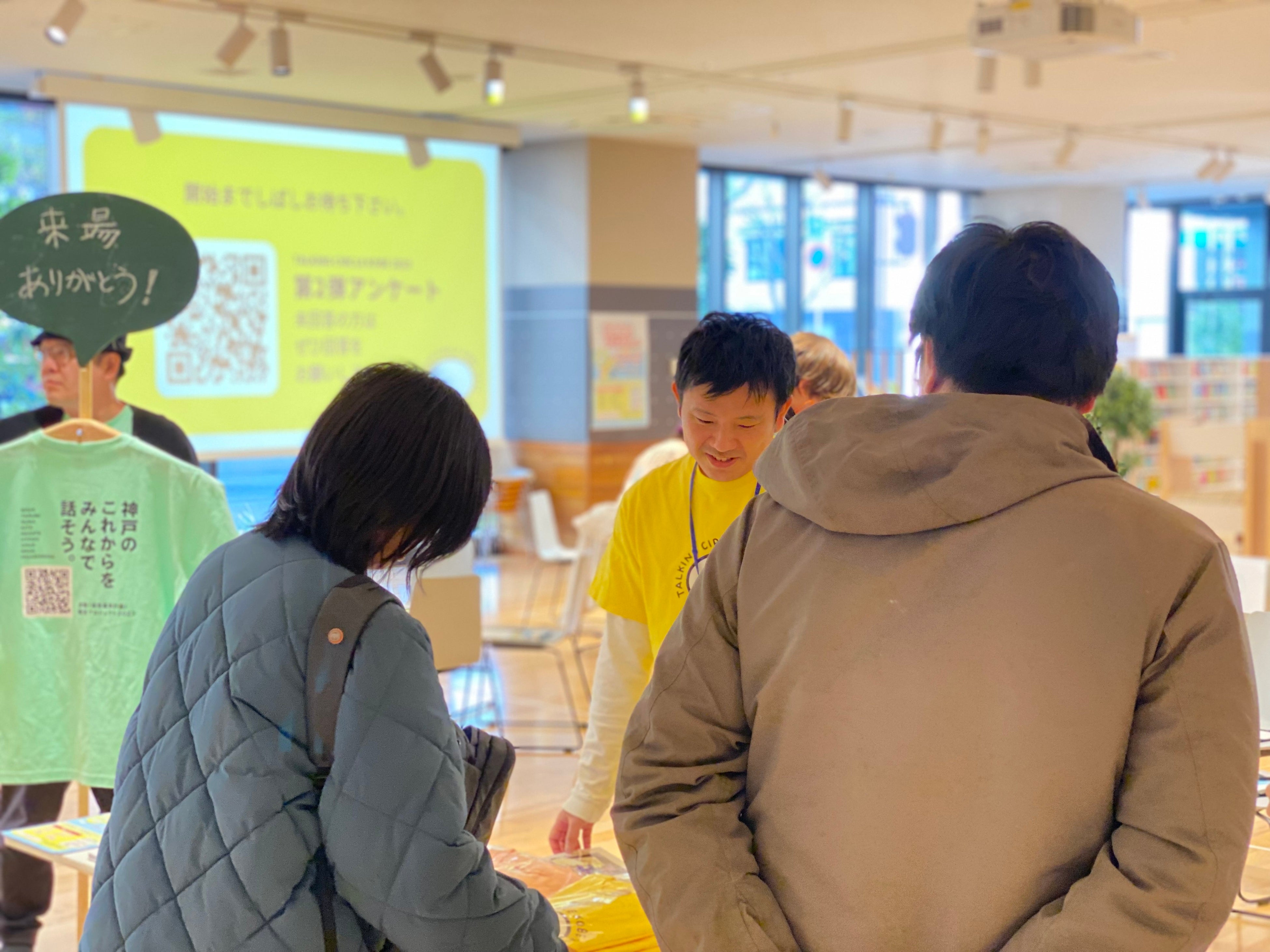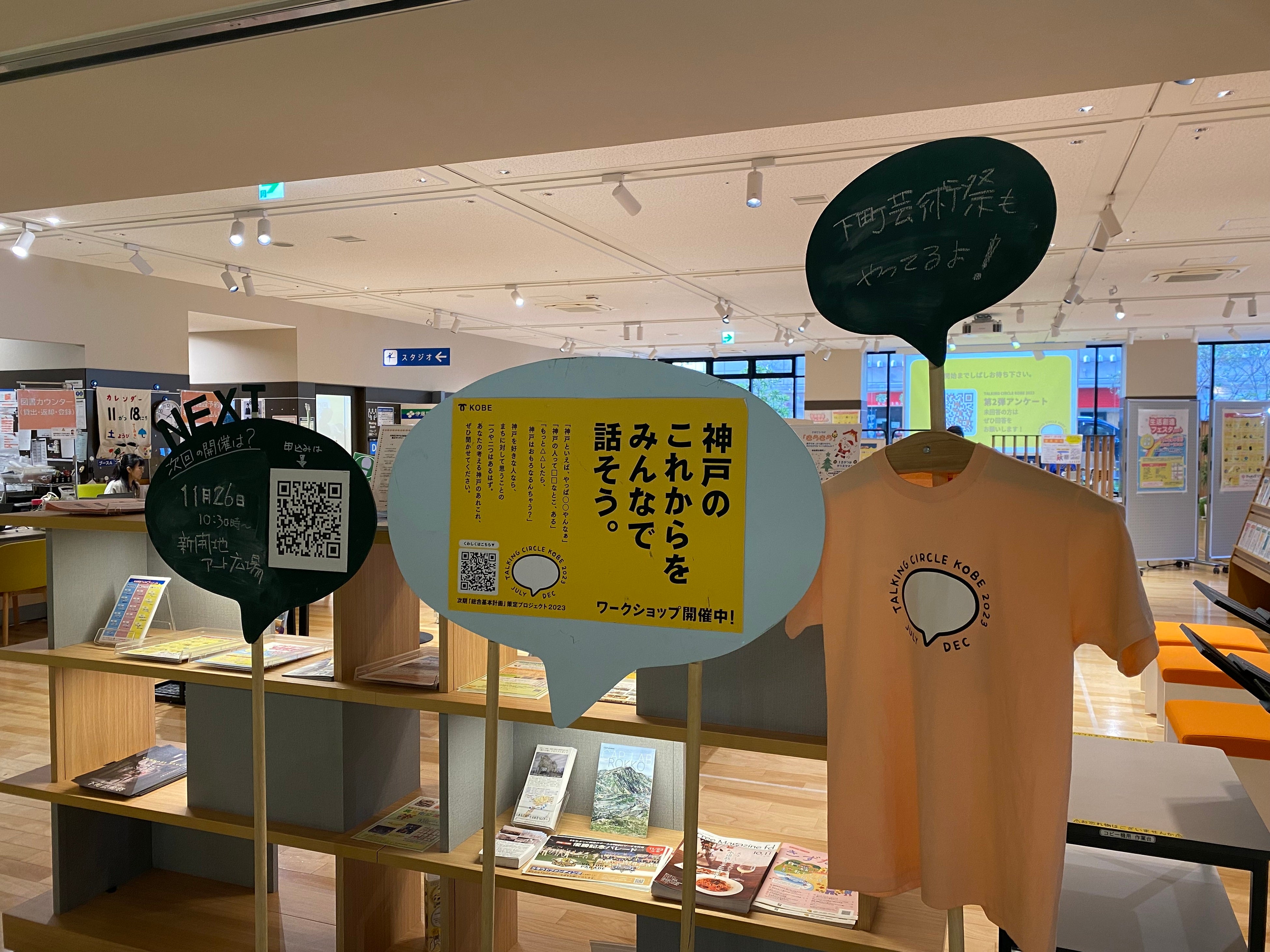 今回、長田区の会場に選ばれたのは、令和元年オープンの新長田合同庁舎の一階にある兵庫県立神戸生活創造センター。キッズスペース付きのフリースペースや、図書コーナー、スタジオ、キッチン、展示ギャラリーなどがあり、地域の交流拠点になっています。芸術の秋、「アートが日常となる下町へ」をキャッチコピーとした「下町芸術祭」の開催期間中で、会場の周辺20箇所で延べ24組のアーティストによるアートな雰囲気の中、トーキングサークルコウベが行われました。