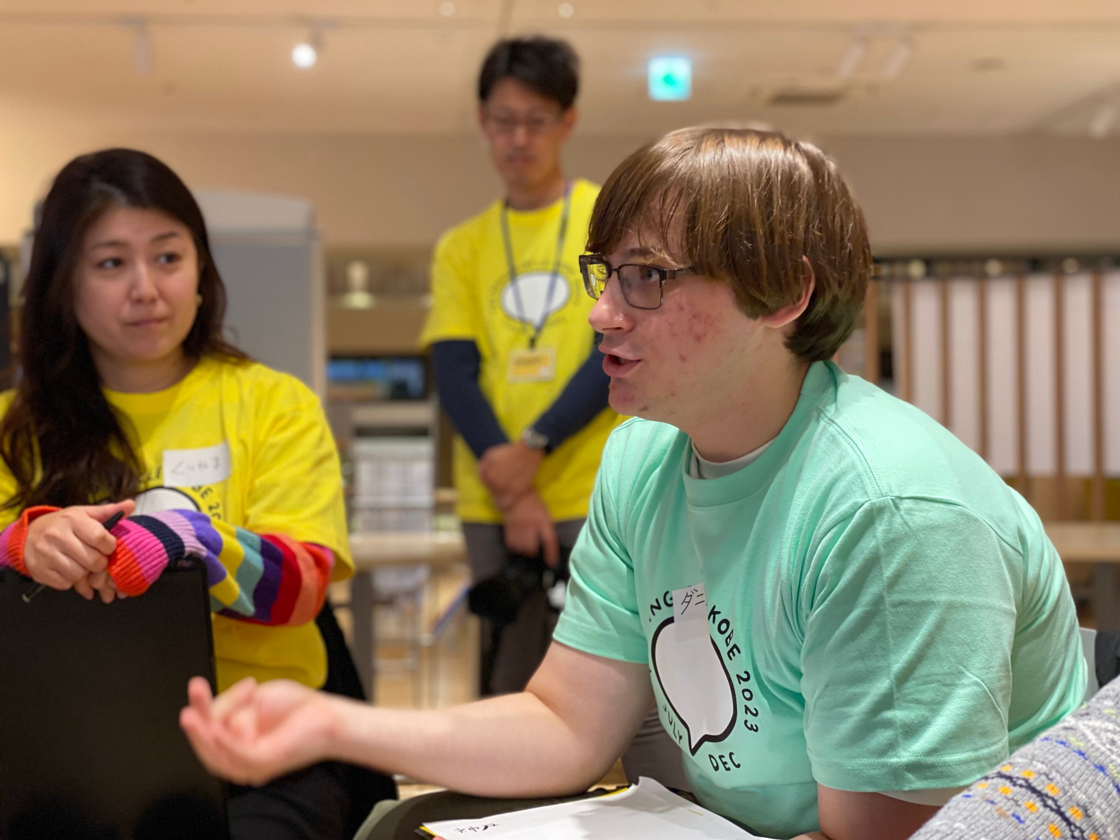 テーマは2つ。「神戸の今」と、「神戸のこれから」をそれぞれのグループに分かれて話をしました。「神戸らしいスポット」を語り合うグループでは、「学校」とあげる人がおり、「神戸独自の学校文化として、『床の油拭き』、上履きがなく『土足』、日直を『日番』と呼ぶ」などの意見が出たほか、「湊川公園」、「鉄人28号近くのベンチなどでの青空将棋の風景」、「ウルトラマンセブンと戦ったロボット怪獣が海に沈んでいるポートタワー&中突堤」などの意見が出ました。