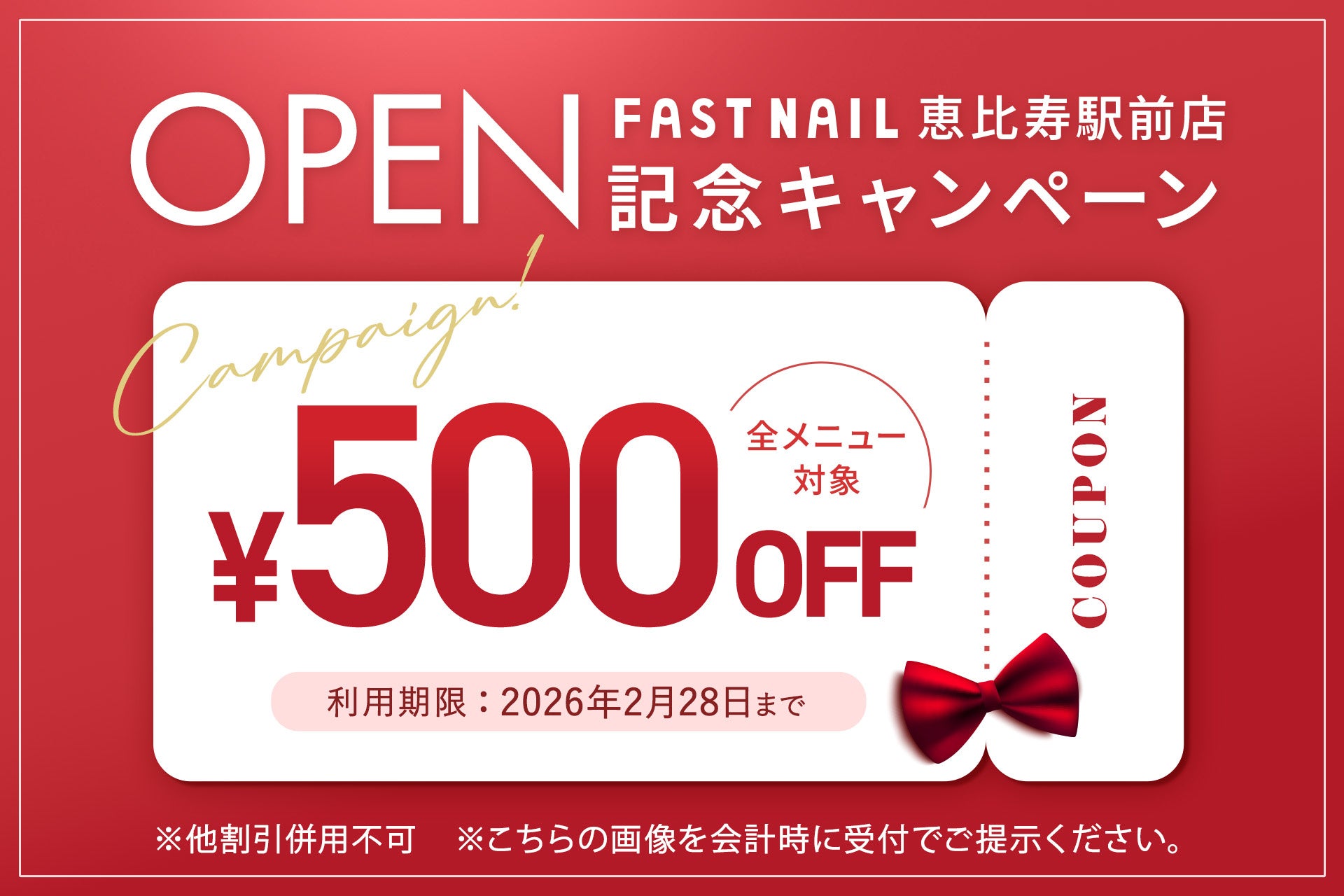 オープンを記念して、「FASTNAIL 恵比寿駅前店」限定で《全メニュー500円OFFキャンペーン》を実施いたします。