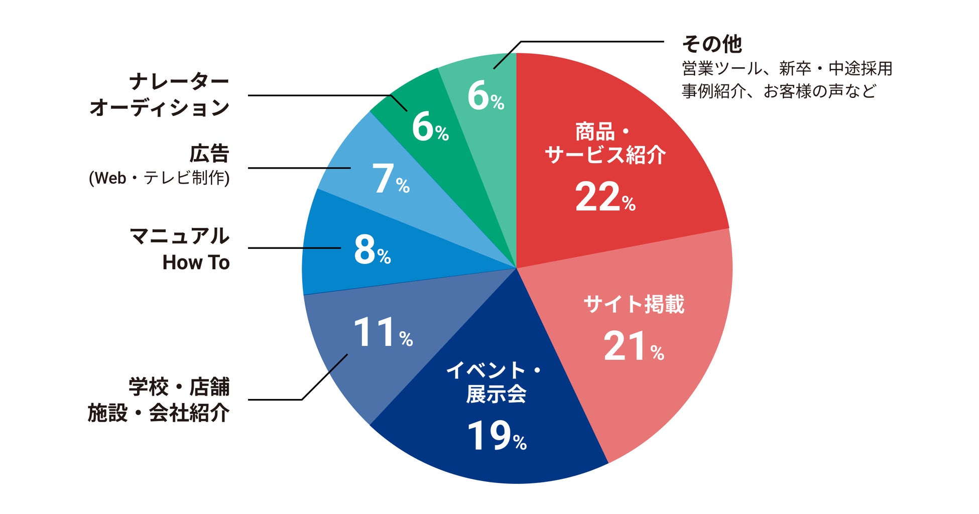 最近では、イベント・展示会、店舗・会社紹介、製品・サービスのマニュアル、HowToなどの動画制作など、従来紙ベースで配布していた資料を動画化する依頼の割合も拡大しました。また、「営業DXに動画を活用したい」、「応募数増加を目的とした採用動画を作成したい」など、業務効率化に動画を活用するご依頼やご相談も増えてきており、多岐に渡る用途の動画制作でVideoWorksをご利用いただいています。