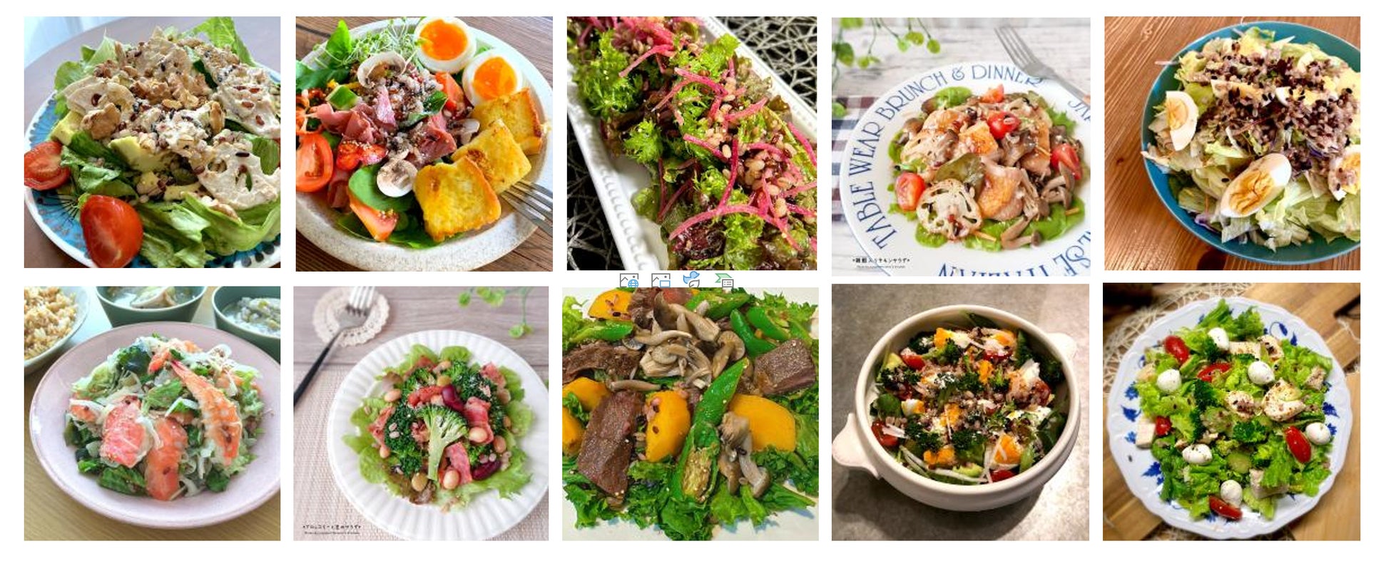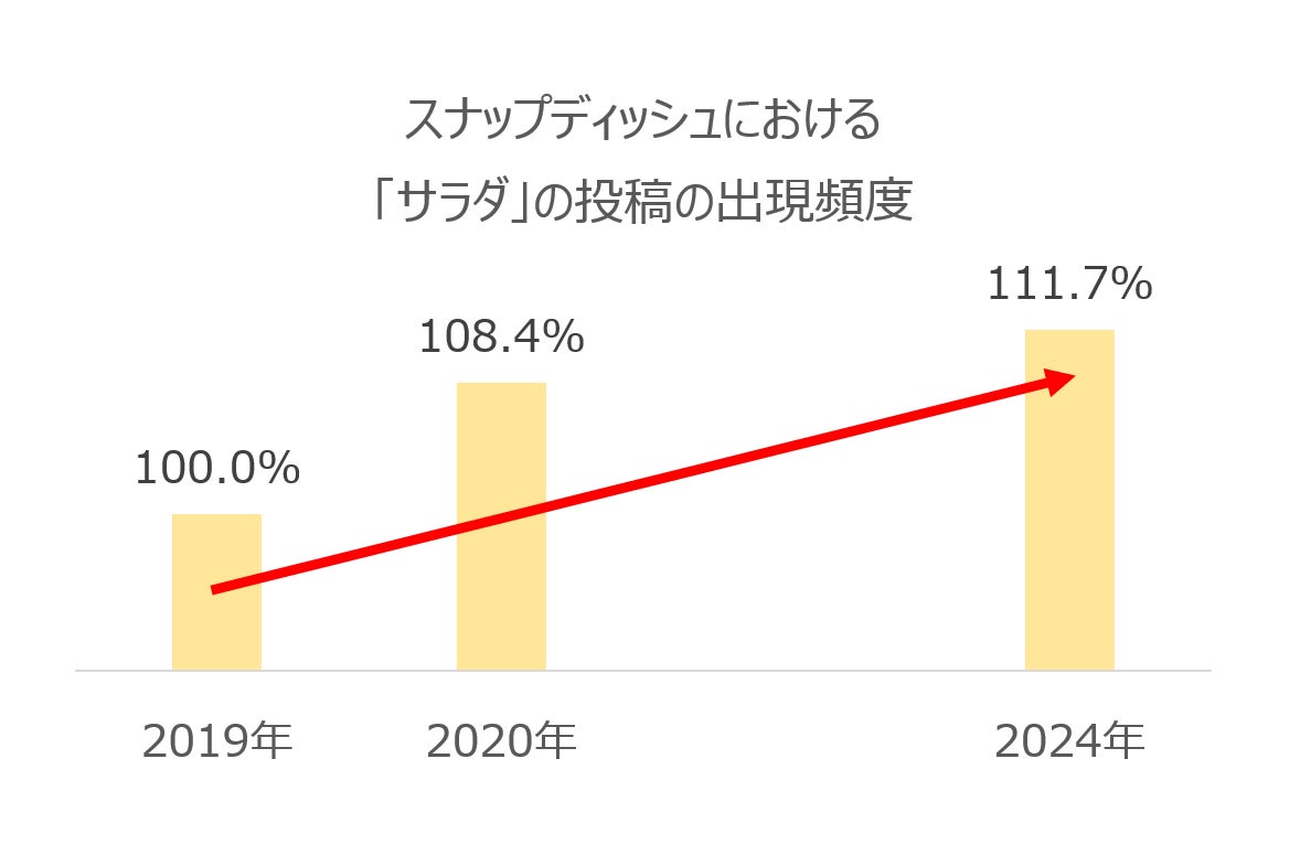 当社の運営する「スナップディッシュ」の生活者においては、2020年のコロナ禍をきっかけに健康意識が高まる様子が見られます。以前当社スナップディッシュユーザーを対象に行った調査では、様々な食材のうち「野菜」がコロナ禍を境に摂取する頻度が最も増える結果となりました。生活者の健康意識の高まり、野菜の摂取意識の向上は依然として続いており、スナップディッシュにおける「サラダ」の投稿出現頻度は、依然として伸長しています。