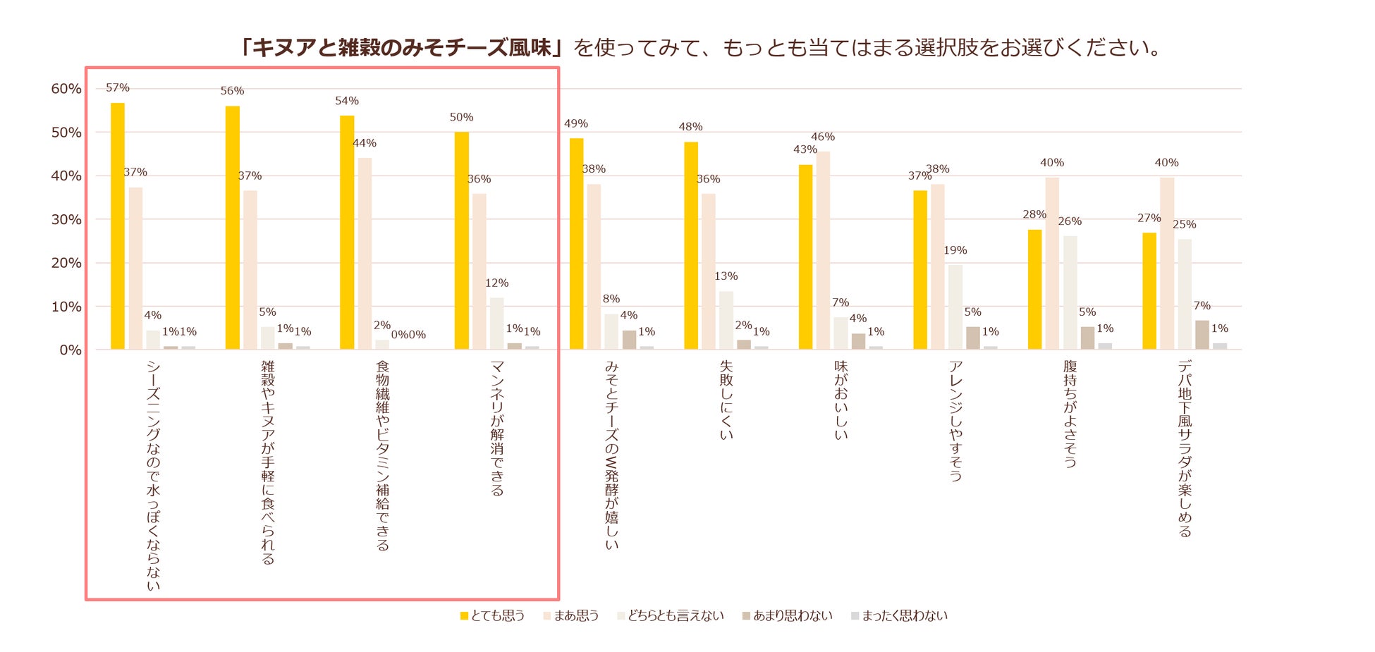 モニターを対象としたアンケートにおいても、「雑穀やキヌアが気軽に食べられる」「食物繊維やビタミン補給できる」「マンネリ解消ができる」といった点が評価されており、本商品1つでまとめて生活者のお悩みを解決できる万能な商品であることが浮き彫りとなりました。