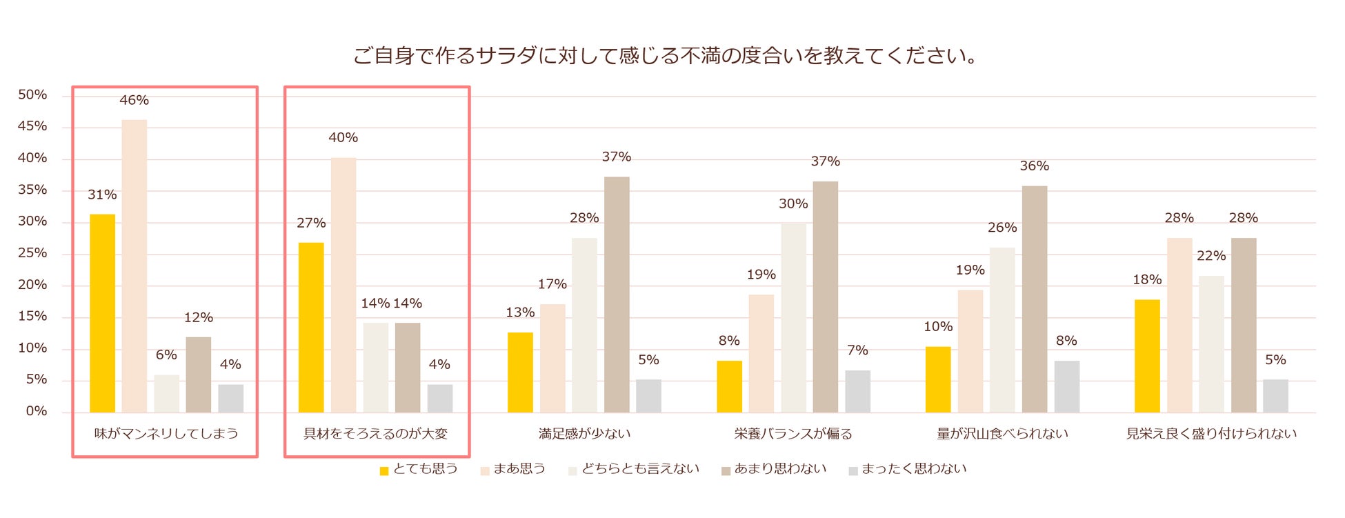 一方で、今回の調査では、「サラダ」に関して「味がマンネリしてしまう」「具材を揃えるのが大変」といった悩みを抱えている人が多いことがわかり、「サラダ」を食卓で摂取することにはいくつかハードルがあると思われます。