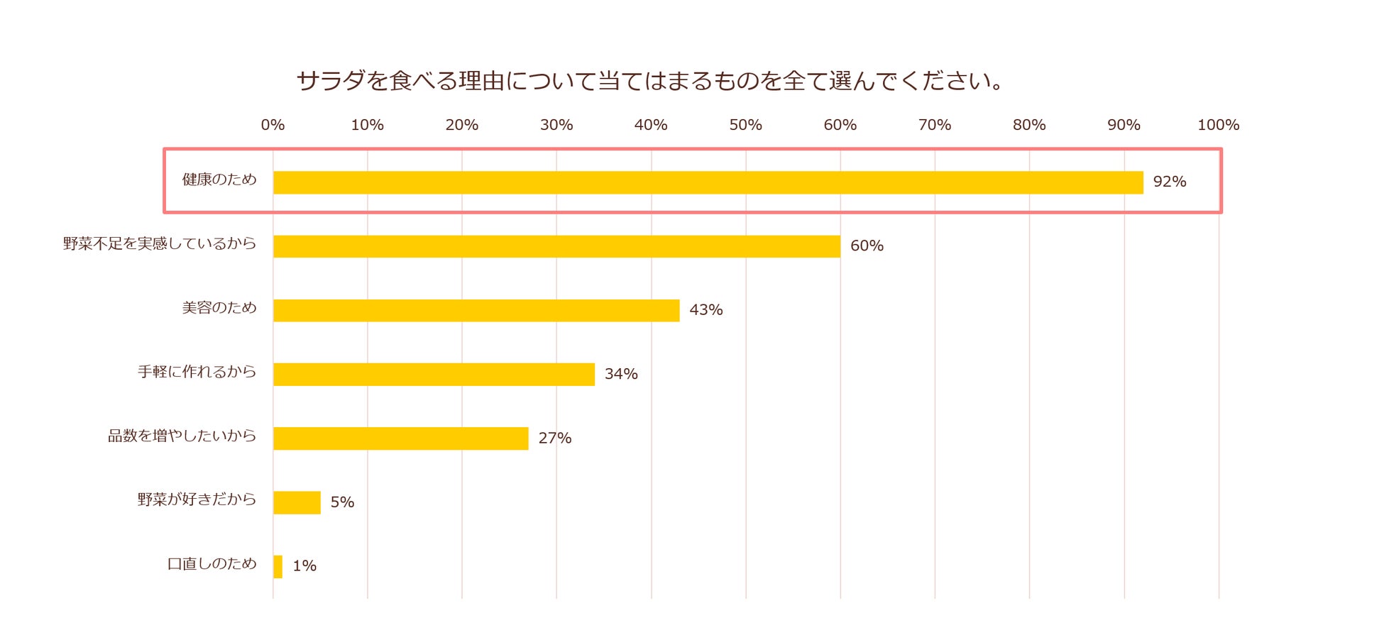 また、今回当社がモニターを対象に行った調査からも、サラダを食べる理由としては「健康のため」が最も多く、健康志向の高まる昨今における「サラダ」のポテンシャルの高さがうかがえます。
