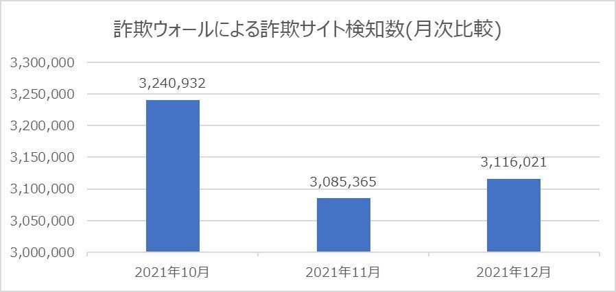 2021年12月に詐欺ウォールによる詐欺サイト検知数は3,116,021件となり、11月と比較すると30,656件増加する結果となりました。※