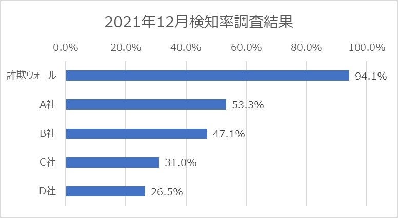 詐欺ウォールを開発・提供するBBソフトサービスでは、公的機関等との連携により収集した詐欺サイトURLを利用し、定期的に詐欺サイトの検知率調査を行っています。2021年12月の詐欺ウォールによる詐欺サイト検知率は94.1%と他社と比較し高い結果となりました。