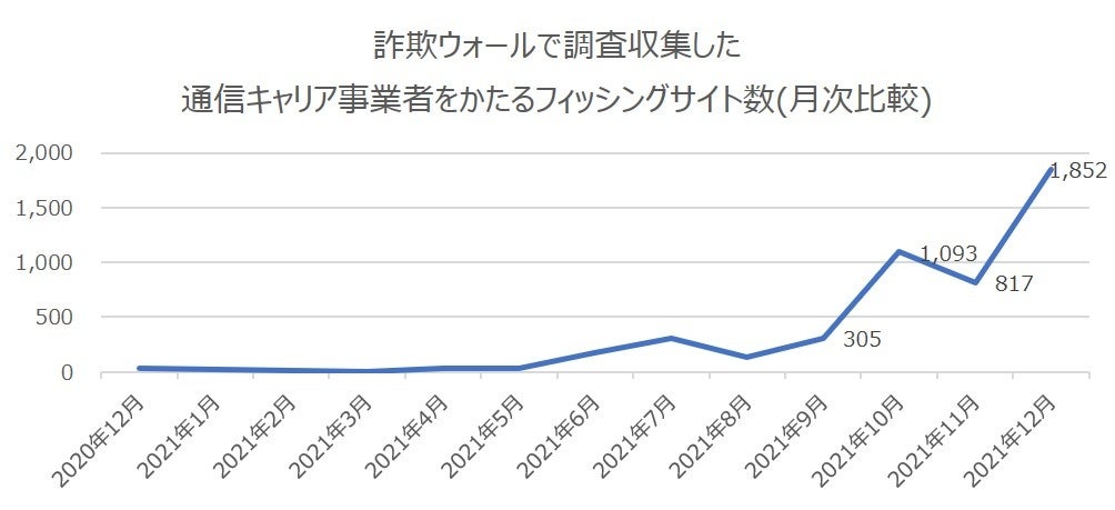 BBソフトサービス株式会社が開発・提供する、ネット詐欺専用セキュリティソフトの詐欺ウォール調査により収集している通信キャリア事業者をかたるフィッシング詐欺サイト数は、2021年10月の1,093件から11月は817件と落ち着いたものの12月は1,852件と前月比2.3倍と大幅に増加しました。