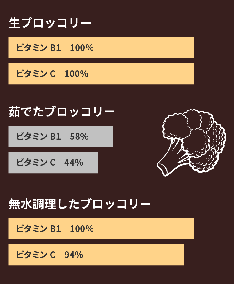 無水調理とは、食材が持つ水分や油分、野菜を洗ったときに残った少量の水分を活用する調理方法です。健康なカラダ作りに欠かせないビタミンCは体内ではほとんど作ることができず、水溶性の栄養成分のため、茹でる調理過程で約半量が溶け出てしまいます。