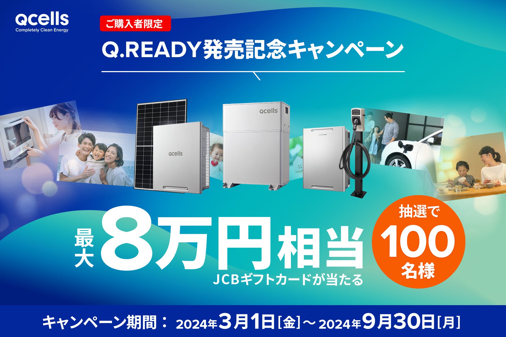世界トップクラスの太陽電池モジュールメーカーであるQセルズを展開する「ハンファジャパン株式会社(所在地:東京都港区 代表取締役:尹 柱)」は、拡張型太陽光発電システム『Q.READY』の販売開始を記念し、2024年3月1日(金)~9月30日(月)の期間限定で、抽選で計100名様にJCBギフトカード最大8万円相当が当たる、ご購入者さま限定キャンペーンを実施いたします。