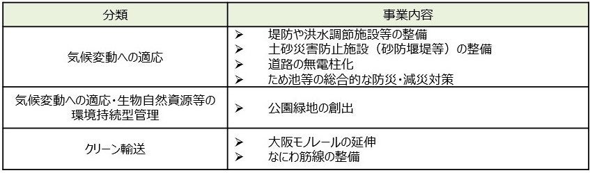 本債券の発行による調達資金は、2050年の二酸化炭素(CO2)排出量実質ゼロの達成(緩和)と気候変動に起因した自然災害による被害の回避・軽減(適応)に向けて、大阪府が取り組むための下表の環境施策に充当されます。