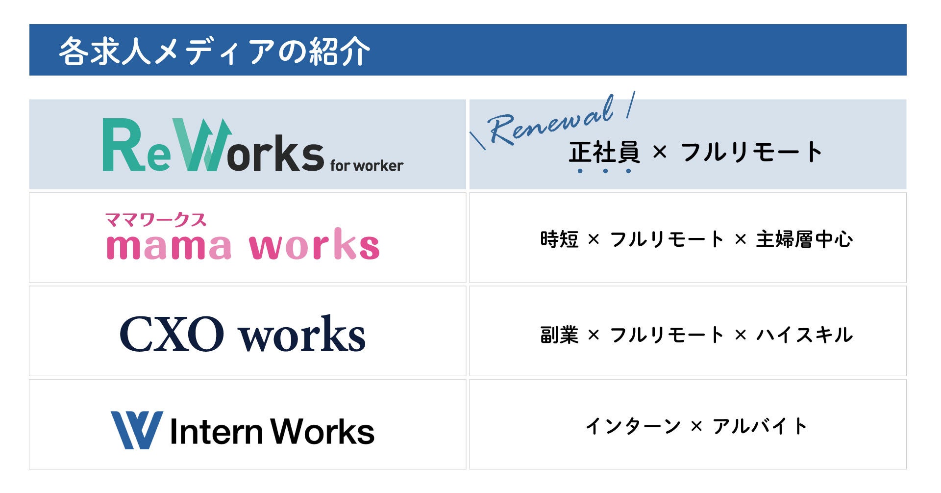 当社では現在4つの求人メディアを運営しています。今回のリニューアルにより、各メディアのコンセプトや掲載できる求人の種類がより明確となり、企業側と求職者側の双方にとってわかりやすく、マッチング率の向上につながると考えます。