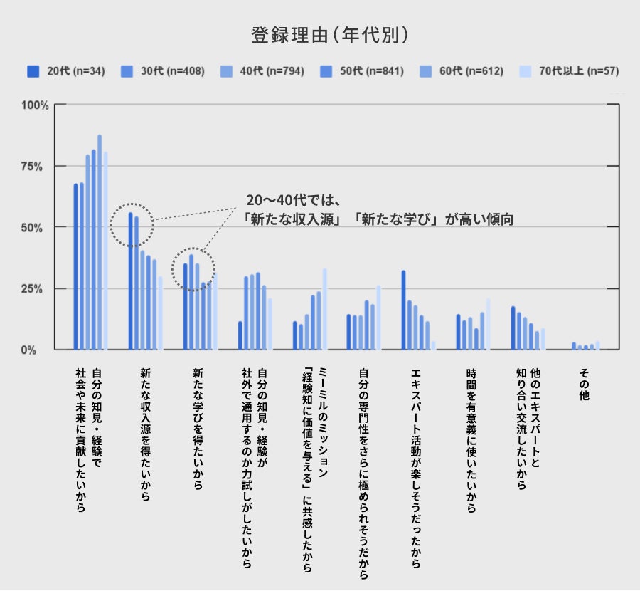 登録理由を年代別に見ると、すべての年代で「自分の知見・経験で社会や未来に貢献したいから」が最多であることが分かります。年代が高くなるにつれて、自身の知見を提供することで社会や未来に貢献できることを価値として感じている方が多い傾向が見てとれます。