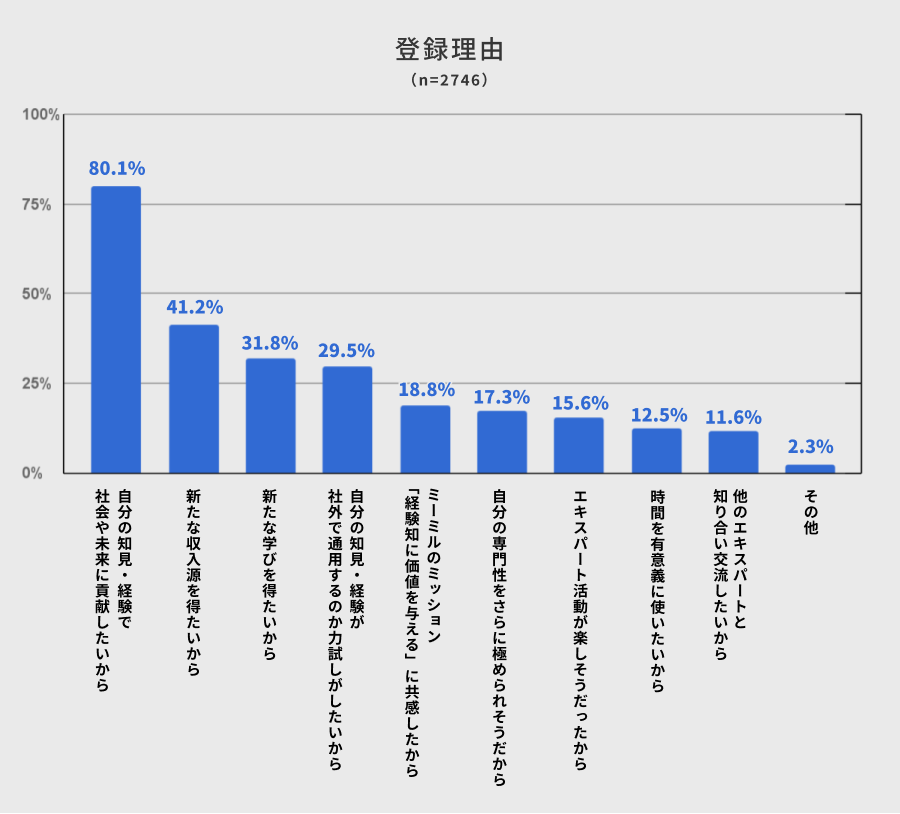 登録理由として「自分の知見・経験で社会や未来に貢献したいから」を挙げた方が最も多く、全体の80%を占める結果となりました。自身が所属する企業や組織に留まらず、社会全体や未来に貢献したいと考えている方が数多くいらっしゃることが明らかになりました。