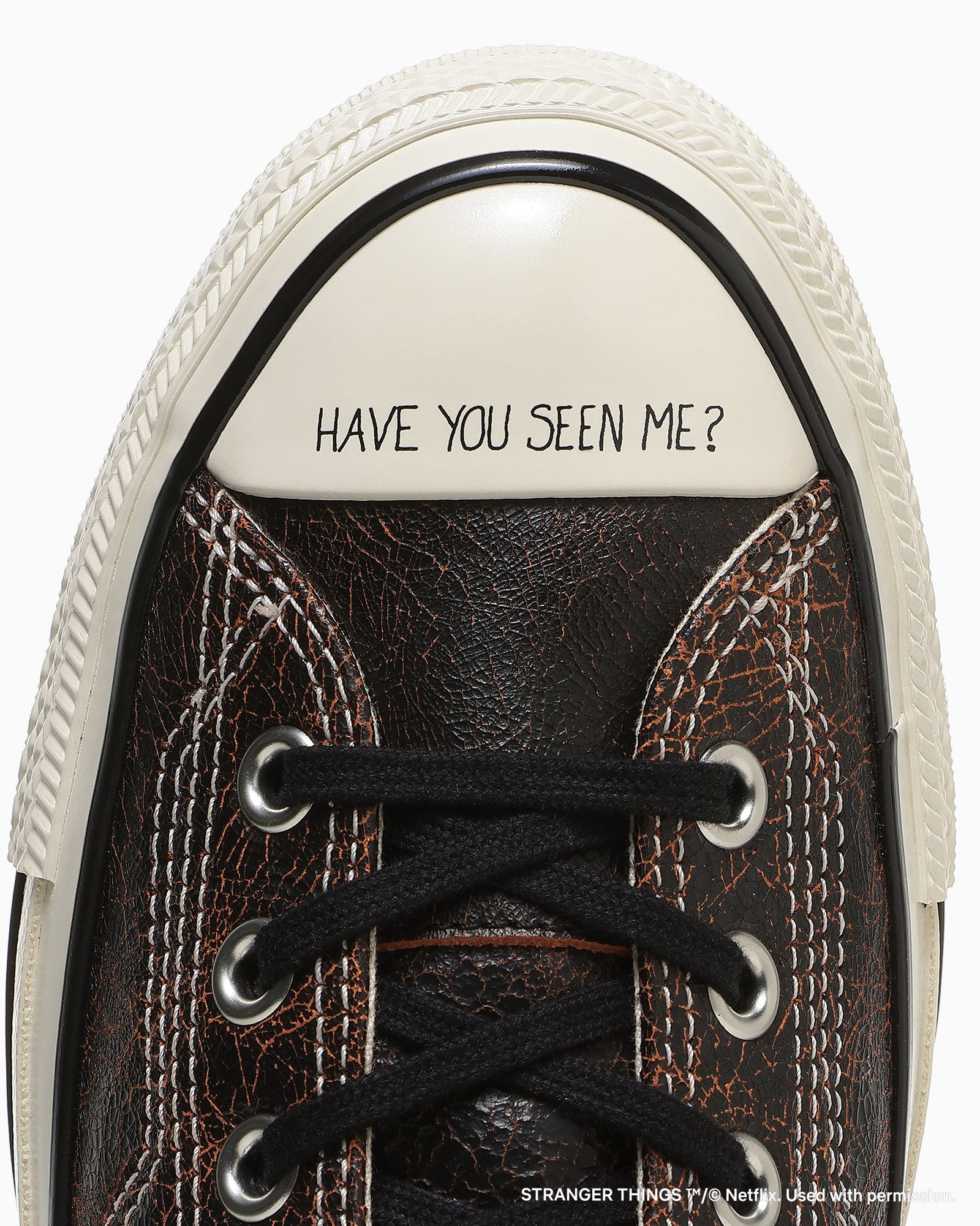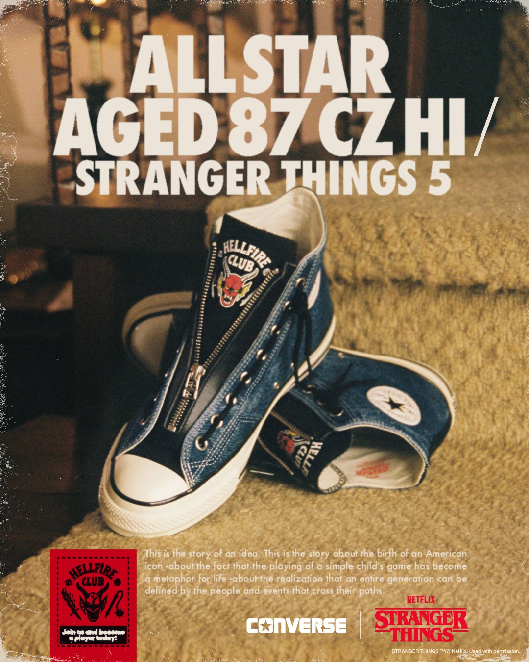・ALL STAR AGEDをベースに「ストレンジャー・シングス 未知の世界 5」の舞台の舞台である1987年のALL STARのディテールを採用。当て布と角ばったサイドステッチ、ノッチ付きのアンクルパッチなどを落とし込んだ特別仕様。
