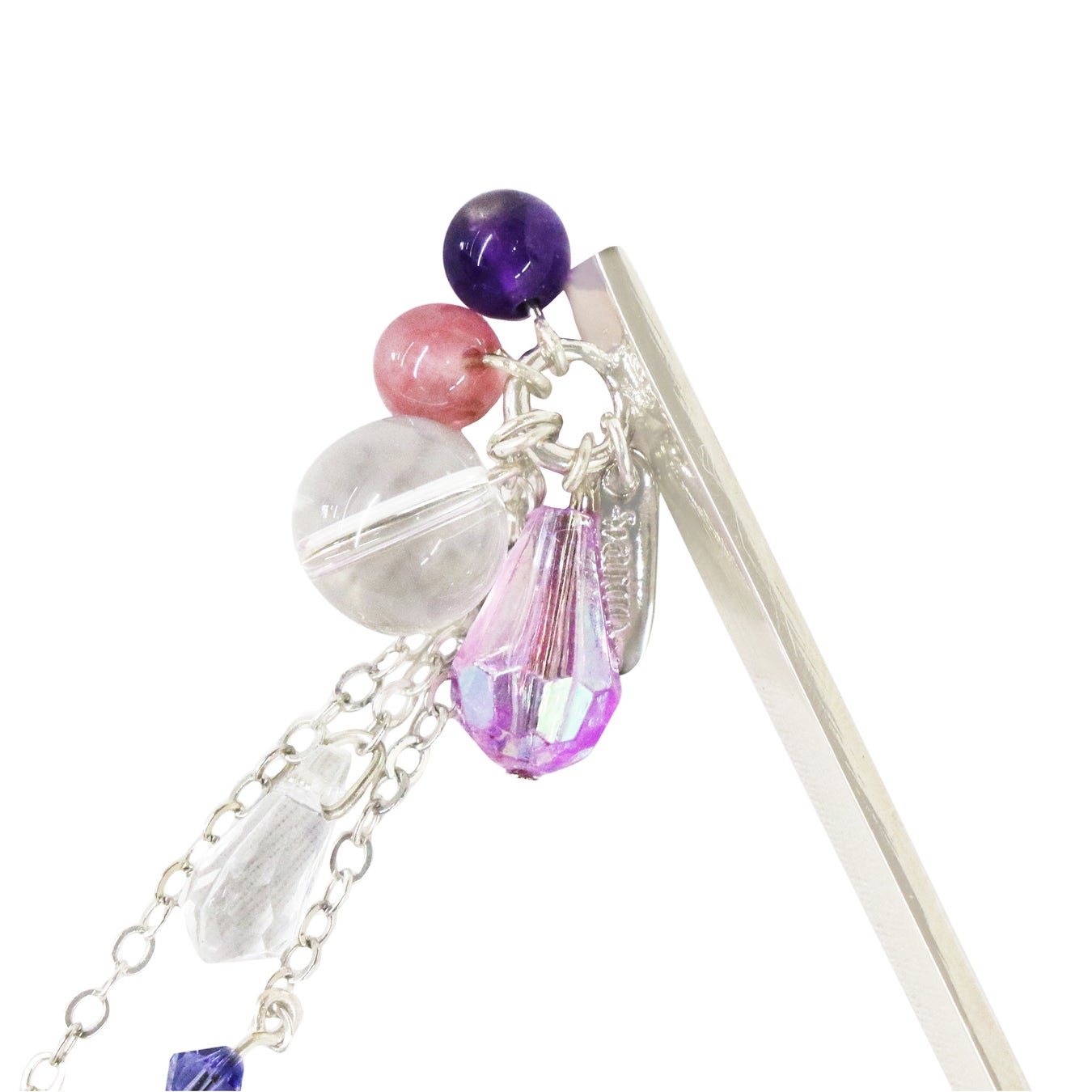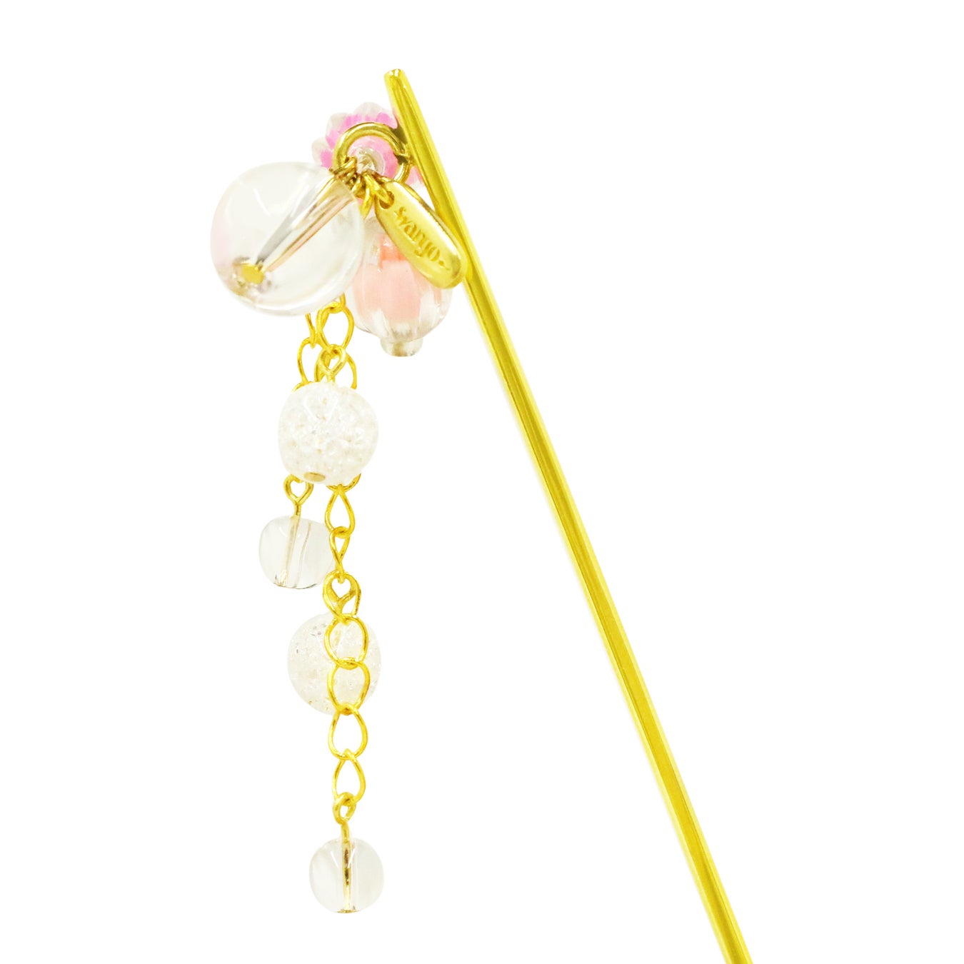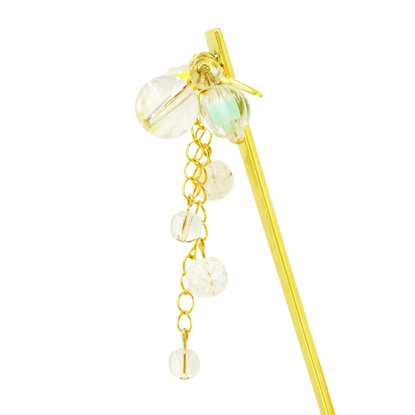 シンプルな色使いで、しなやかに下がるビーズが清涼感を演出。ゴールドやシルバーを基調とした軸との組み合わせで上品さを添えながらも、重ね付けにも馴染む洗練された簪です。季節や装いを問わず普段使いしやすいデザインに仕上げました。