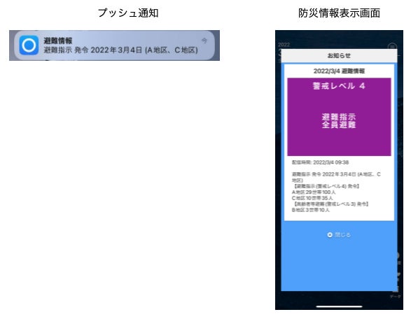 実際にLアラートからの防災情報を配信するのは、2022年4月1日からの予定です。日々の行動データを備蓄する必要があるため、また、2022年3月22日から25日にかけてテスト配信を実施したいと考えているため、先行してリリースします。