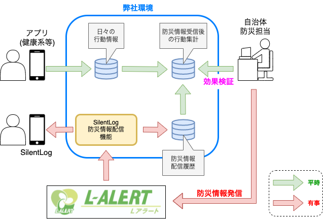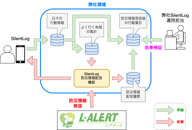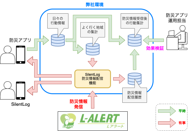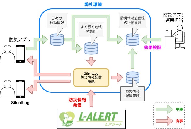 Lアラート ( https://www.fmmc.or.jp/commons/ ) から防災情報を受信し、SilentLogアプリにプッシュ配信します。平時からアプリに保存された日々の行動情報を分析し、アプリユーザーごとの「よく行く地域」を集計します。防災情報が発令された有事の際には、ユーザーごとによく行く地域の防災情報を配信します。平時の集計結果により防災情報を配信しますので、あらかじめ防災情報の受信地域の設定が必要ありません。ユーザーごとに、よく行く地域の防災情報を即座に自動配信します。また、防災情報が発令された後の行動情報も集計して効果測定を行い、防災情報の配信方法を改善していきます。