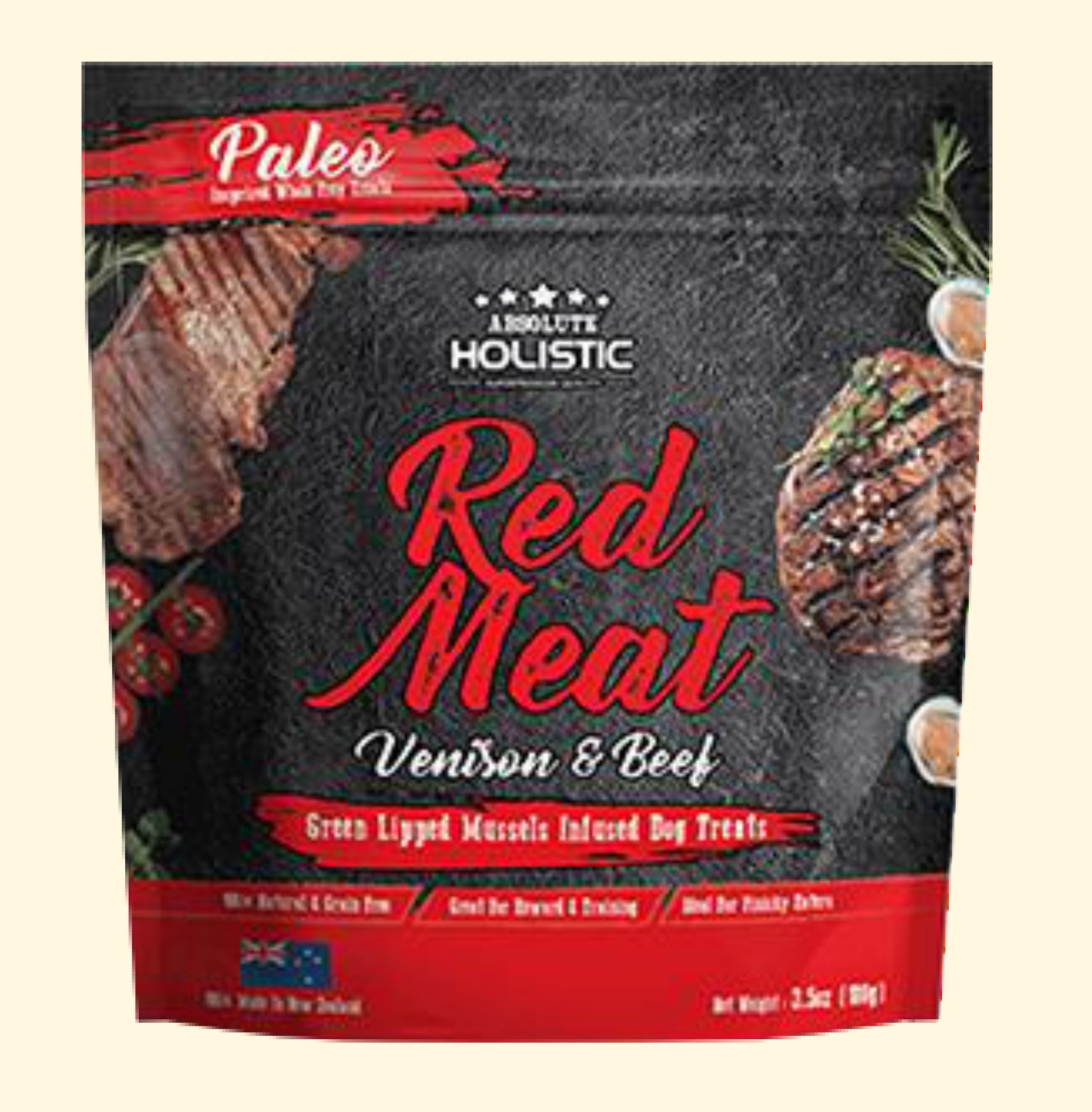 ニュージーランド産の厳選食材を使用したプレミアムジャーキー。肉食獣本来の食事にひらめきを得た、まるでお肉をそのまま切り裂いたような犬が喜ぶジャーキースタイルのフード&トリーツです