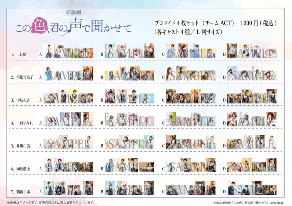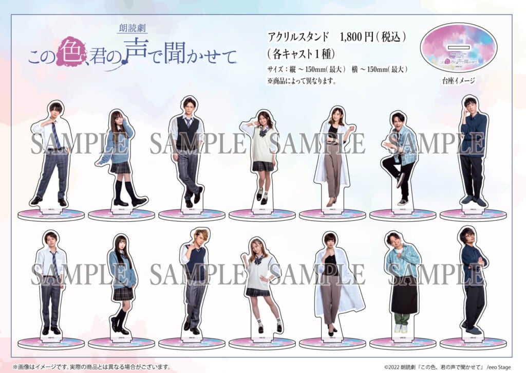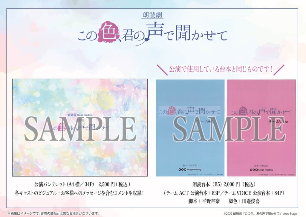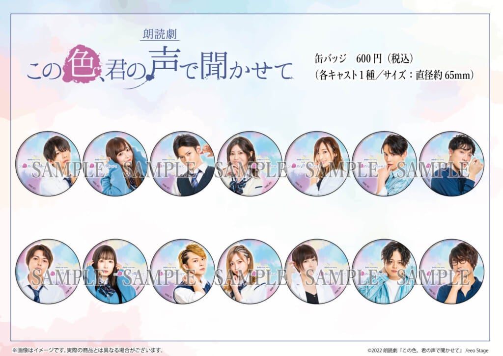 集めて飾りたくなるブロマイドや缶バッジの他、朗読劇『この色、君の声で聞かせて』の魅力がギュッと詰まった公演パンフレットや朗読台本などのグッズも登場!