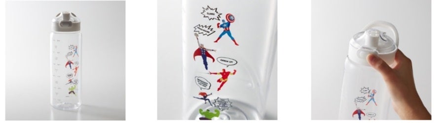 「ウォーターボトル『マーベル』」は、タイムマーカーが付いており、毎日の水分摂取の時間と量の目安がわかる仕様です。容量は約1000mlと持ち運びにも便利なサイズなので、トレーニング時はもちろん、熱中症予防のためのこまめな水分補給など、日常生活でも広く活躍するアイテムです。フタはワンタッチオープン、ロック機能付き。「キャプテン・アメリカ」や「アイアンマン」等、「アベンジャーズ」のヒーロー達のコミカルなデザインに、ほっと一息つけそうです。