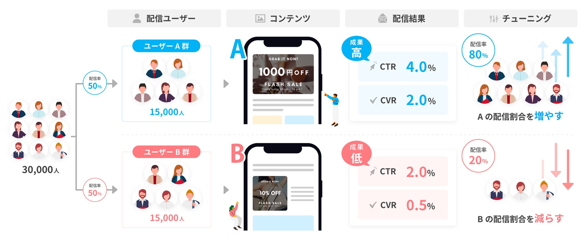 「開封率」や「クリック率」をもとに、最も成果の高い分岐割合を学習し、ABテストの分岐率を自動で最適化します。