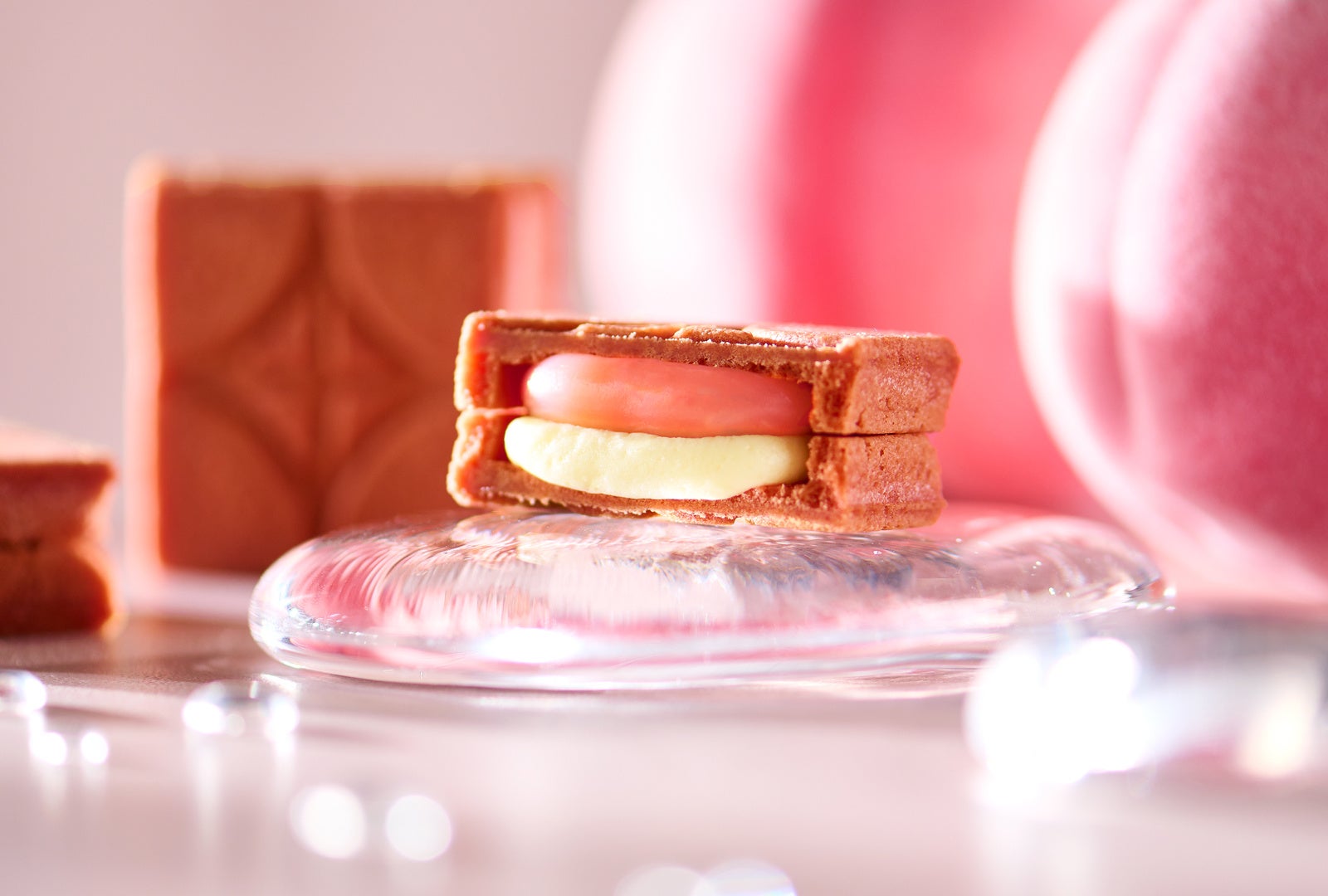 桃ガナッシュと、果肉感のある桃ジャムを練り込んだミルキーでコク深い桃バタークリームをサクサク食感のクッキー生地で挟みました。かじった瞬間にガナッシュの濃厚さと甘酸っぱさ、バタークリームのやさしい甘さがとろりとあふれ出し、桃そのものを食べているような凝縮した味わいが口いっぱいに広がります。