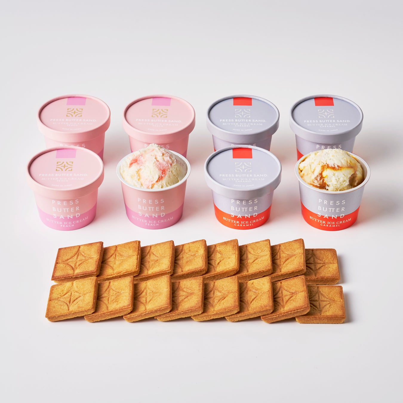 定番人気の少し塩味の効いた「バターアイスクリーム〈キャラメル〉」、新商品の「バターアイスクリーム〈桃〉」が4個ずつと、「プレスバタークッキー」が入ったセット商品です。