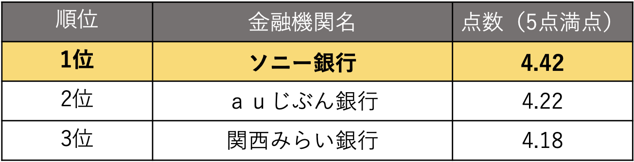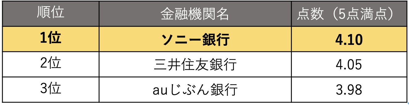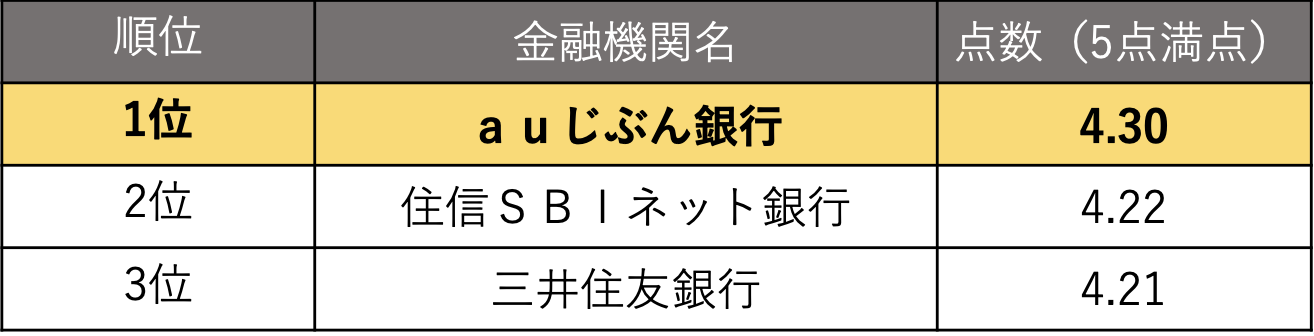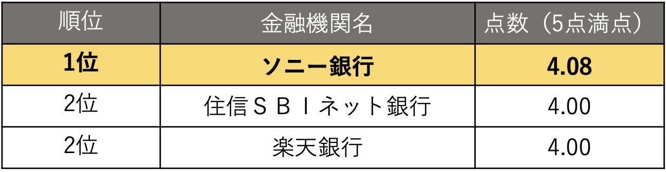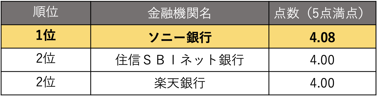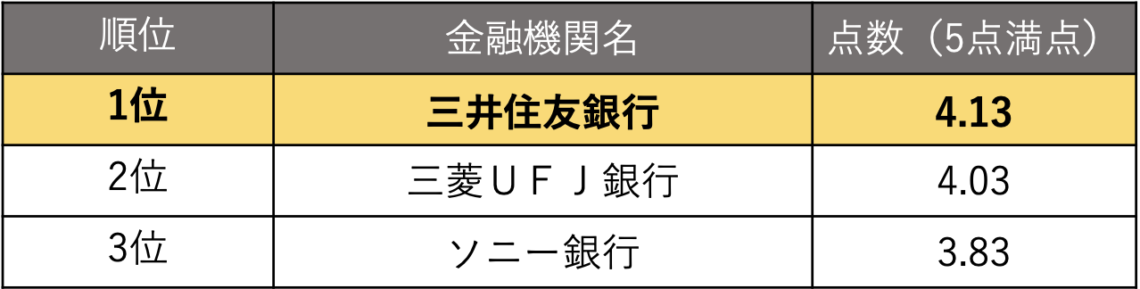 金利満足度、手数料などの諸費用に対する納得度、団体信用生命保険の満足度、銀行担当者の対応への満足度の4つの指標でユーザーにアンケートを実施しています。また、総合ランキングは4項目の合計得点の高い金融機関をランキングしています。