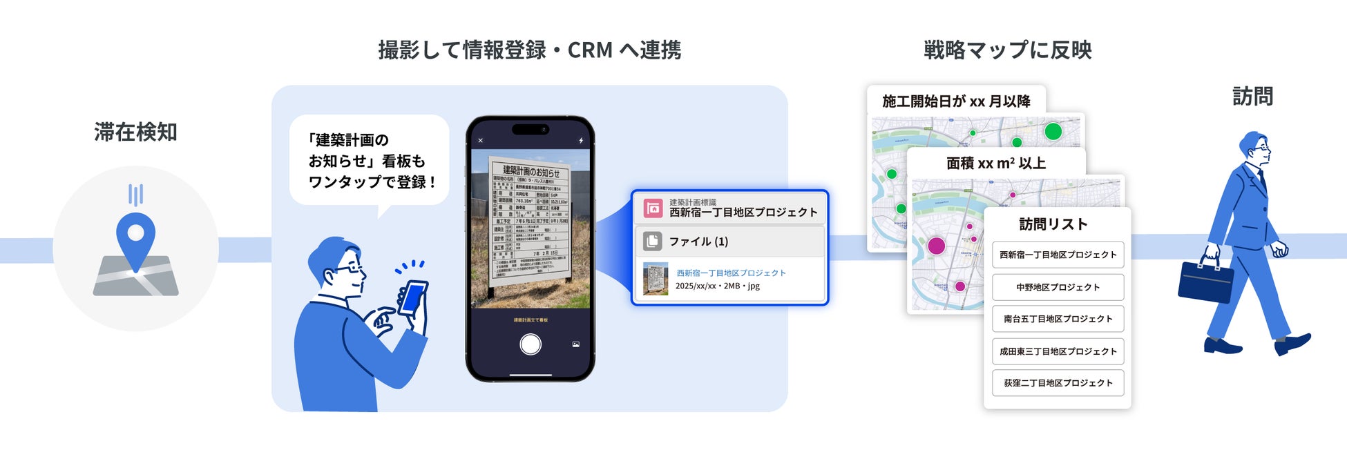 例えば、建設機械をレンタル・販売する企業では、工事予定情報が記載された「建築計画のお知らせ」の看板を撮影するだけで、施工開始日や工事面積に基づいたターゲットマップを自動生成できます。また、施設設置機器のラベル情報をもとに最新機種、関連商品、部品交換の提案を行う、リース契約書をもとに契約満了時期にあわせたアプローチを行うなど、業種、営業手法に合わせたさまざまな方法で活用できます。