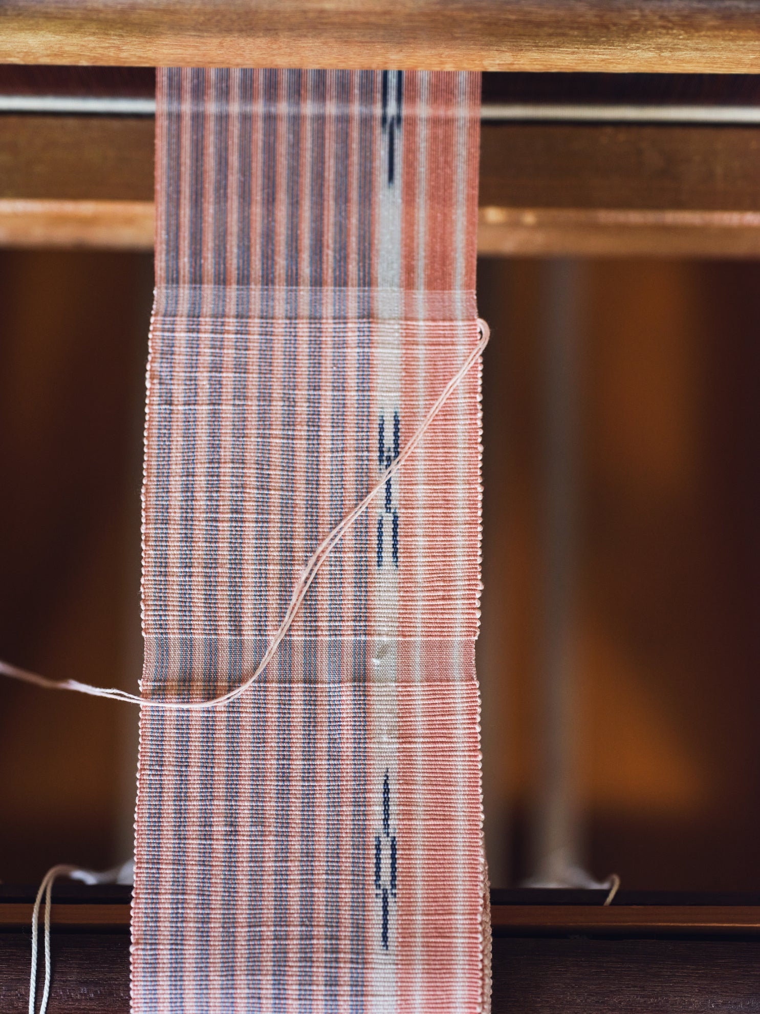 「ミンサー」は沖縄の伝統的な織物の一つで、沖縄本島より約400kmに位置する大小19の島からなる八重山諸島を中心に作られています。その中でも、沖縄県では3番目に広い「石垣島」、沖縄の古くからの集落・家屋が最も残る「竹富島」、イリオモテヤマネコで知られる自然豊かな「西表島」が主なさんちです。島に自生する植物からつくる天然染料で染めた先染めの綿糸を用い、今もなお一本一本が手織りで織りあげられています。