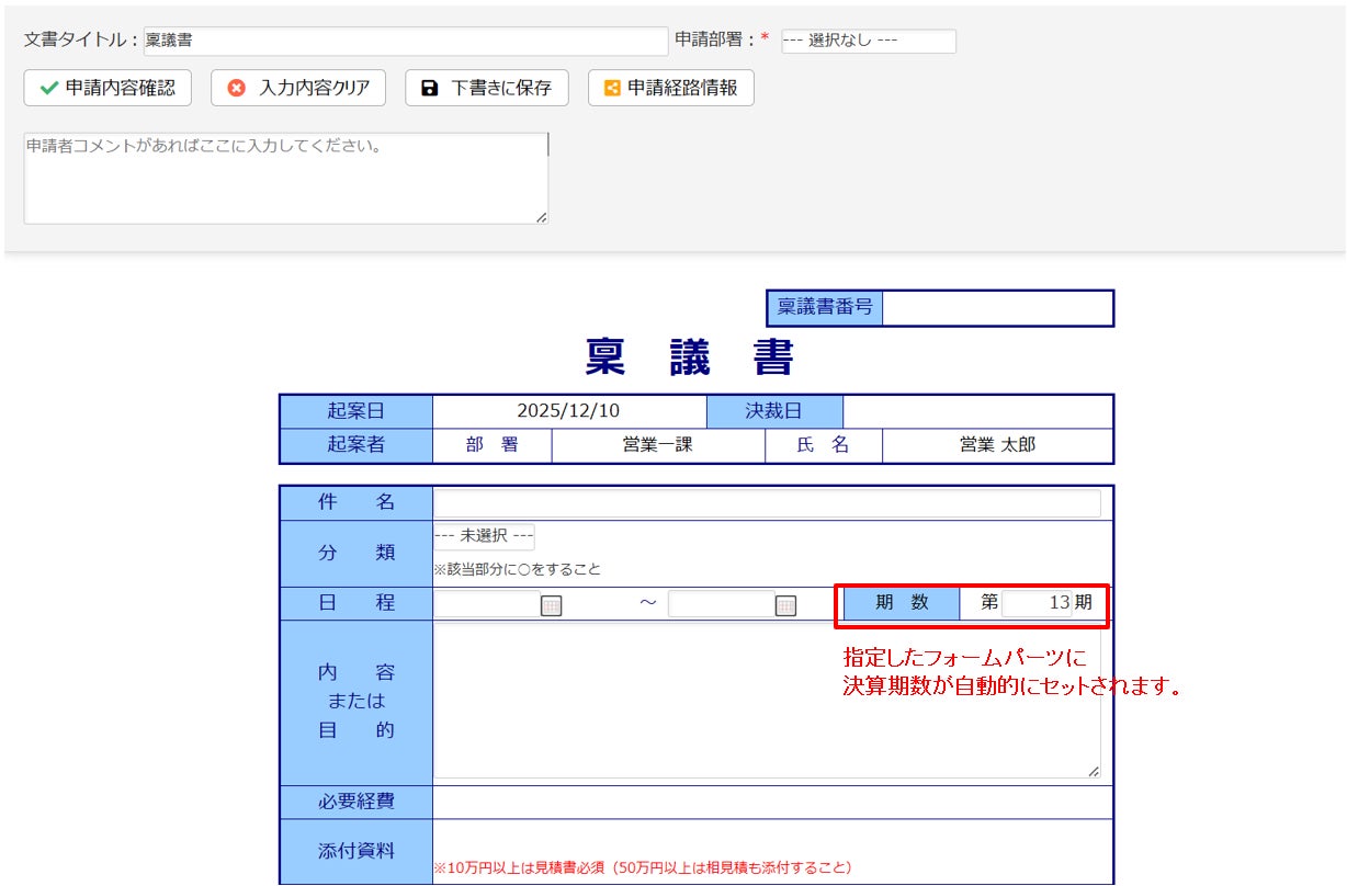申請日がどの決算期に属するかを自動計算し、その決算期数を申請書の指定したパーツに表示します。