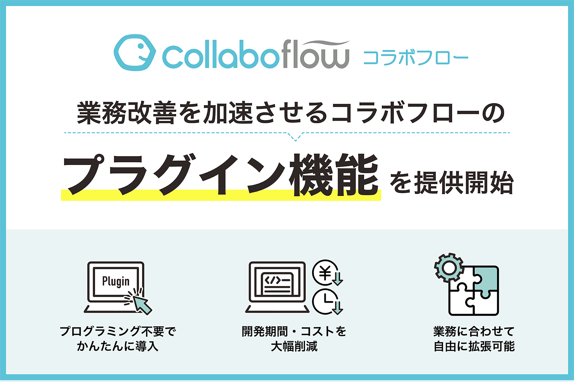 新たに提供する「プラグイン機能」は、この技術的な難しさを取り払います。コラボフロー本来の使いやすさを活かしつつ、簡単な設定のみで柔軟な機能拡張が可能になりました。