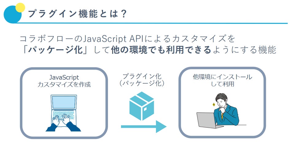 プラグイン機能とは、コラボフローのJavaScript APIによるカスタマイズを「パッケージ化」して他の環境でも利用できるようにする機能です。