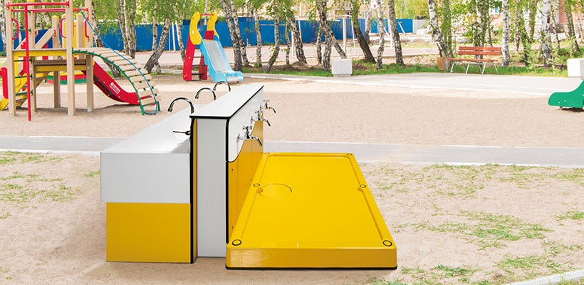 幼稚園や保育園などの施設では、裸足保育の観点から素足で外遊びをするケースが多くあります。遊び終わった際に使用する足洗い場の大半はモルタル製などの現場施工品です。現場施工品はデザインの自由度が高い一方で、湿式工法のため、乾燥させる必要があり一定期間工期が必要なうえ完成までに天候にも左右されるデメリットもありました。